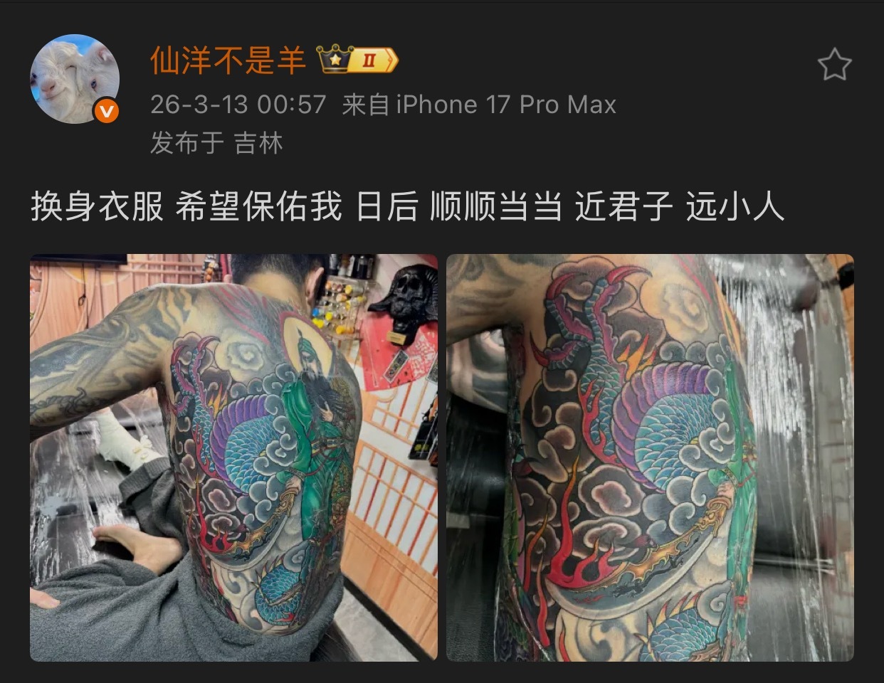 仙洋新纹身:换身衣服,希望保佑我,日后顺顺当当,近君子远小人!