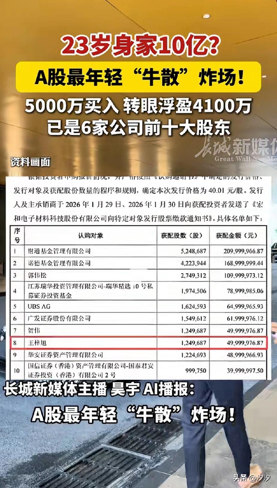 23岁身家十亿, 小说中的霸道总裁出现了, 23岁的00后沈阳小伙王梓旭火了, 他被号称为A股最年轻的牛散, 刚花5000万买入, 转眼间浮盈4100万, 出手就是几个亿, 1.5亿拍金瑞矿业, 1.8亿认购北新路桥, 截止去年9月, 他已经成为了6家公司的前十大股东, 持股市值超10亿, 可以说是最有财力的零零后, 媒体纷纷在猜测他到底是天赋异禀, 还是说背后的实力深不可, 一个常年游走在法拍 市场的年轻人, 短短几年时间就将自己的资产翻了很多倍,你说他没背景谁信? 毕竟这种市场敢去深入挖掘的, 都不是一般人, 这次他在a股火的原因, 可能就是暴露了自己的背景深厚, 这样的人生简直开了挂, 比爽文小说还要厉害, 大家觉得这位零零后背后势力是不是强大? 00后老总 00后隐形富豪 辽阳富豪 00后商业奇才 百万股儿子