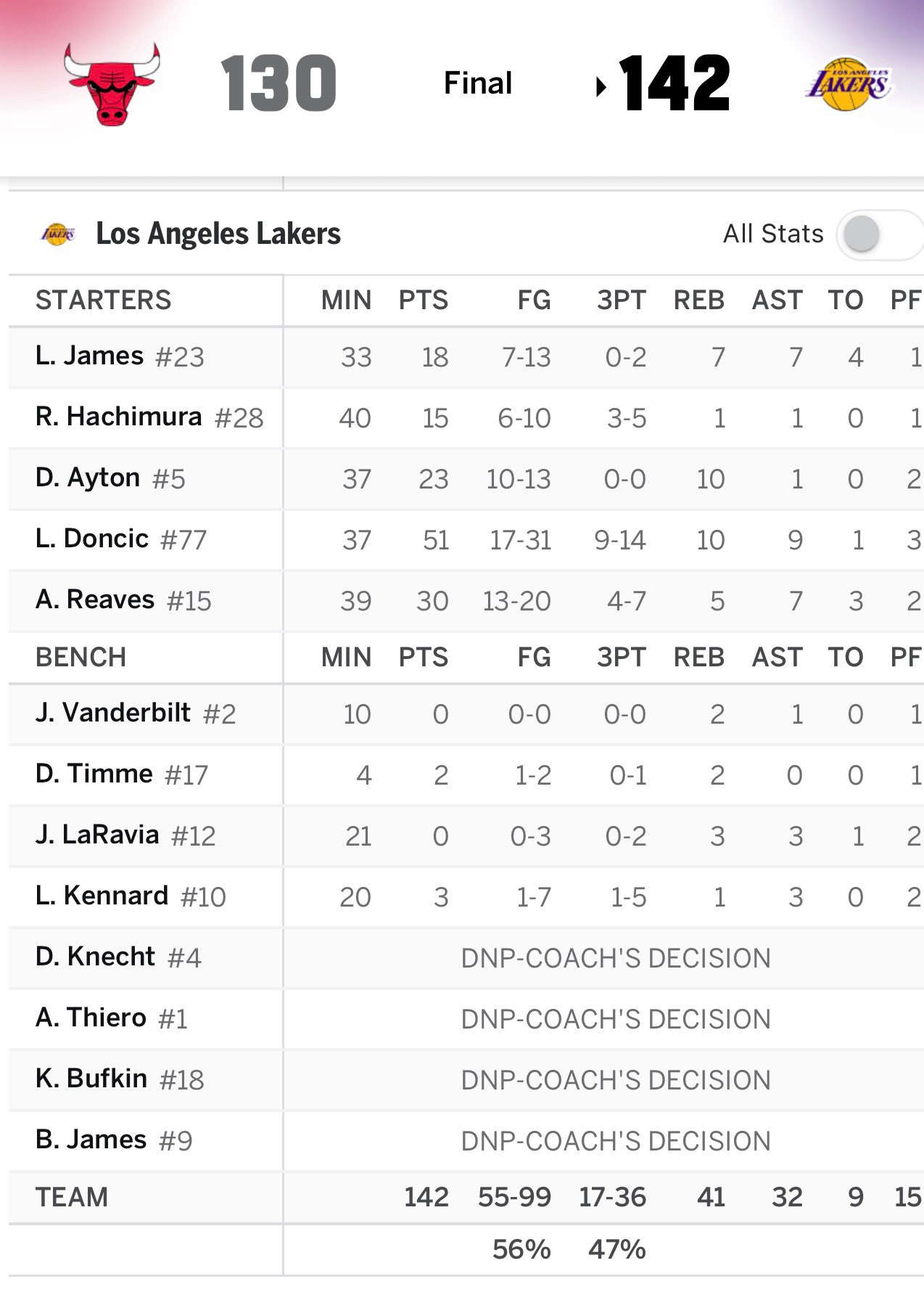 詹姆斯严重影响了东里的比赛,搞的他俩今天一共才拿了81分,湖人全队才142分。湖人