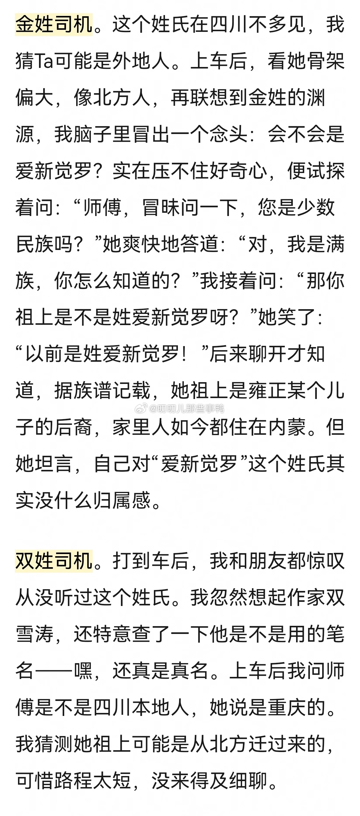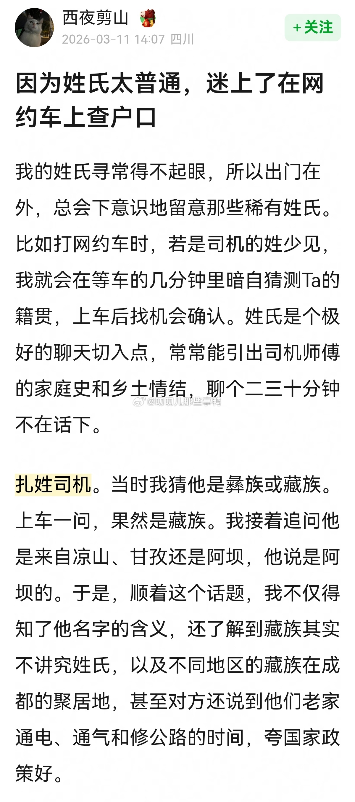🈶意思,而且有调研精神的帖子→“因为姓氏太普通,迷上了在网约车上查户口”