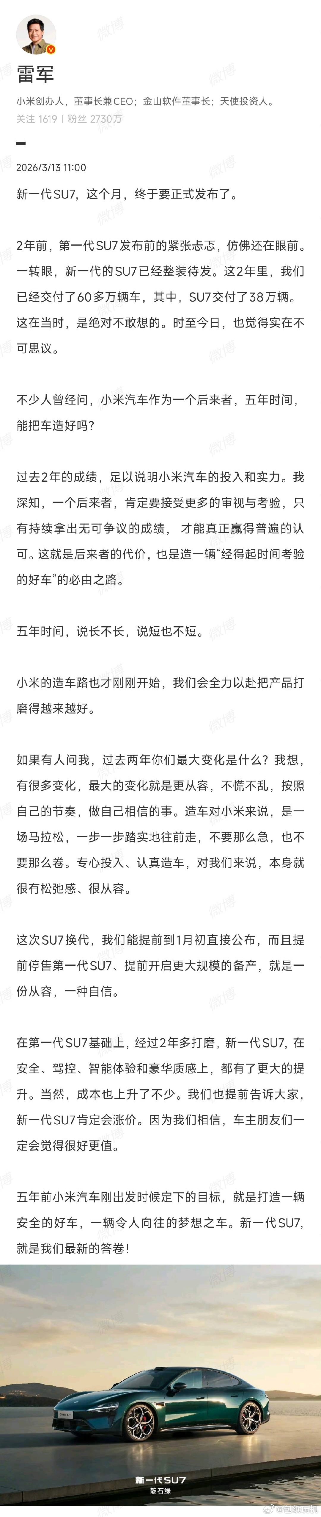 雷军称造车是马拉松不用特别卷 5年前确实没想到小米汽车作为后来者能走到今天,本以为小米会靠卷这条路,但是并没有,反而是不急不躁有自己的节奏。新一代SU7打磨了2年才端出来,而且提前告知产品规划,提前安排停售节奏,给用户吃定心丸,不搞背刺,在当下汽车圈还是值得学习的。车企想好卖得好,终归还是要看产品够不够硬,你们觉得这次新一代SU7产品力够强吗?