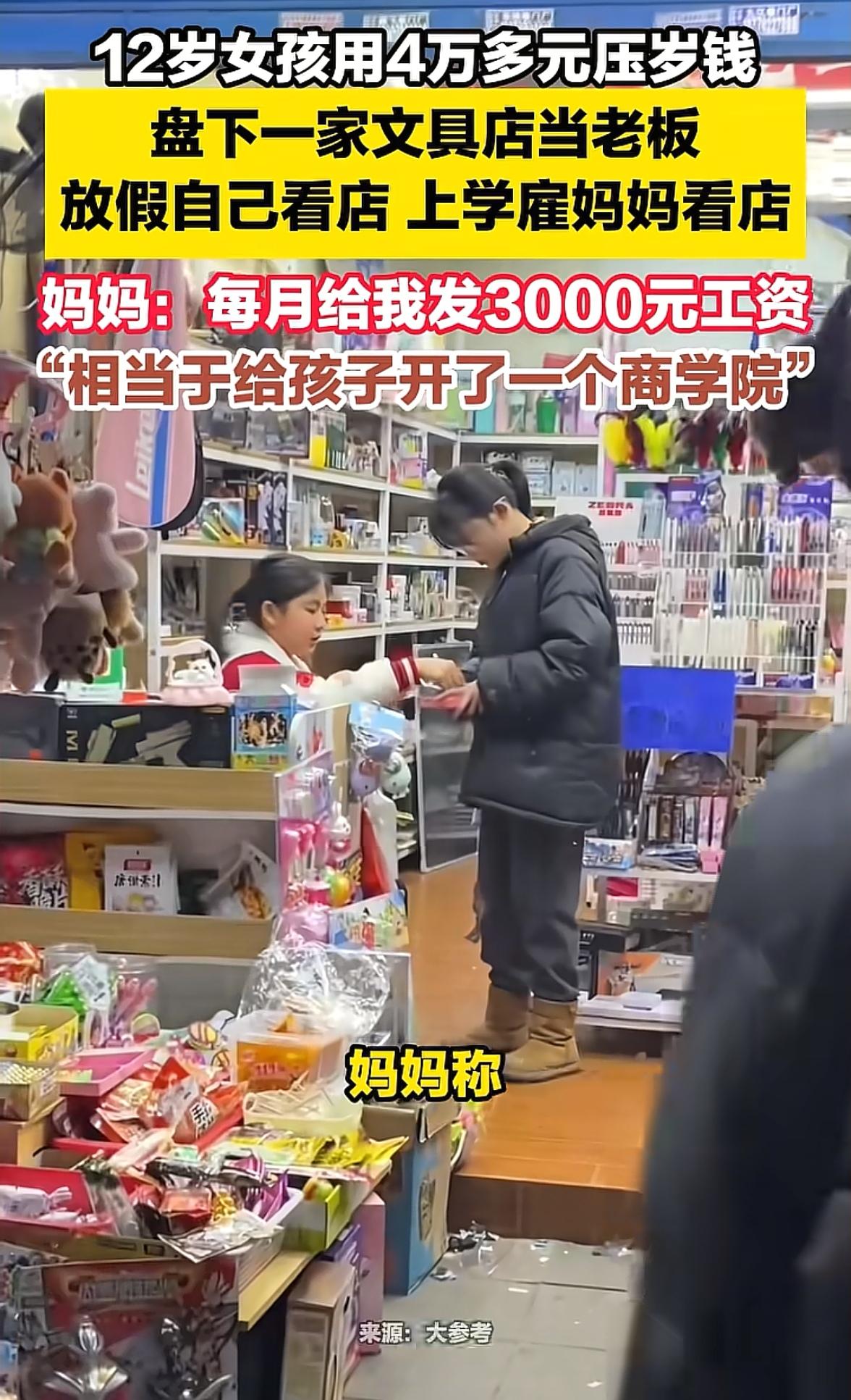 刚刚看到一个新闻, 被震惊到了, 江西一个12岁女孩,用4万多元压岁钱, 盘下一家文具店自己当老板。 这孩子为啥创业呢?她妈妈说,孩子觉得把零花钱存银行利息低,不划算,就用攒的钱开了店。放假她自己看店,上学时雇妈妈白天看,晚上放学她再接着看,还每月给妈妈发3000工资。 不得不说,这小姑娘太有主见和商业头脑了!小小年纪,就懂得合理规划钱财,抓住商机。很多成年人都未必有这魄力和想法。她未来的路,估计会走得相当精彩。 咱得从这孩子身上取取经,你们说,要是换做自家孩子,能有这本事吗?