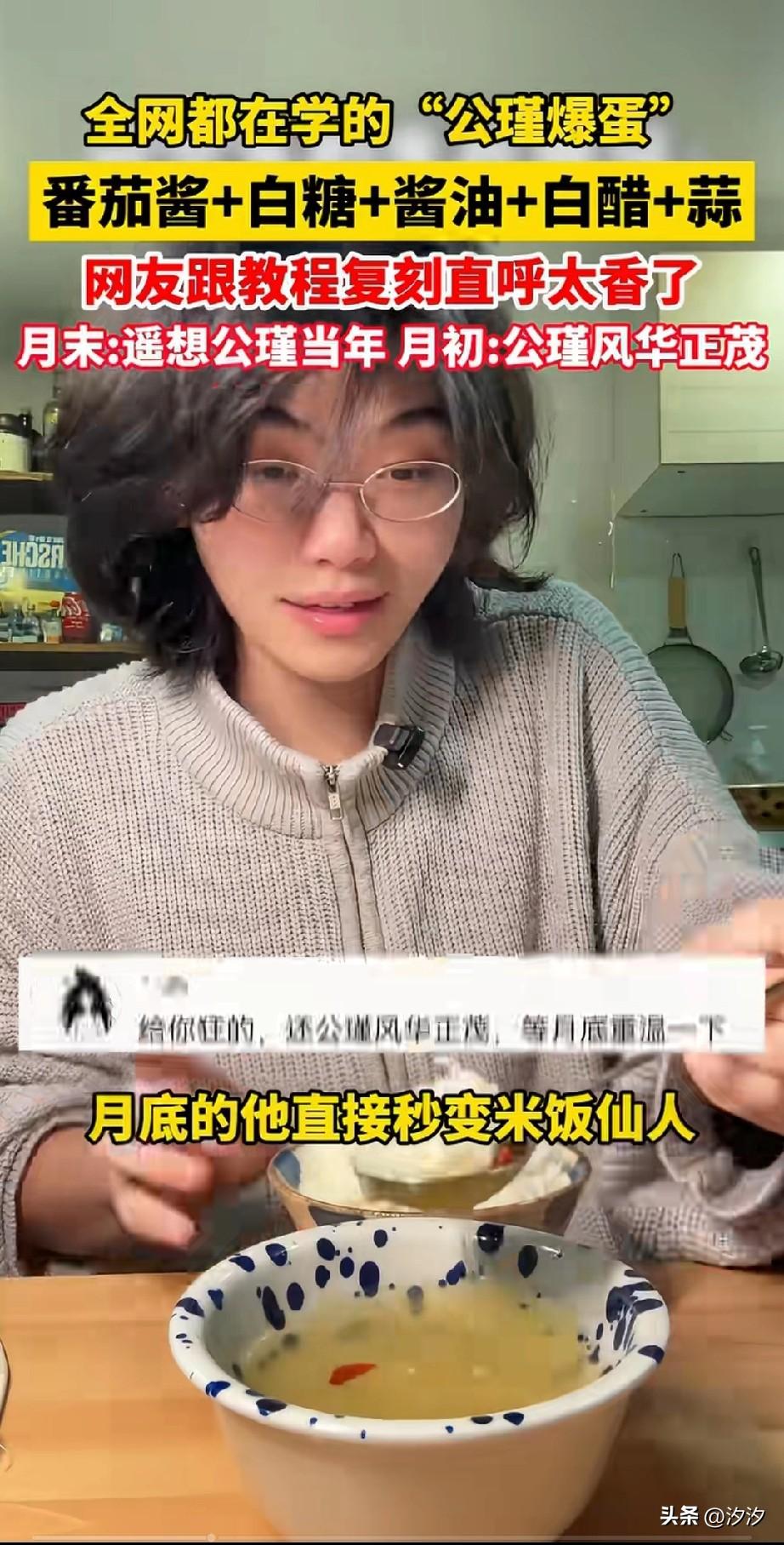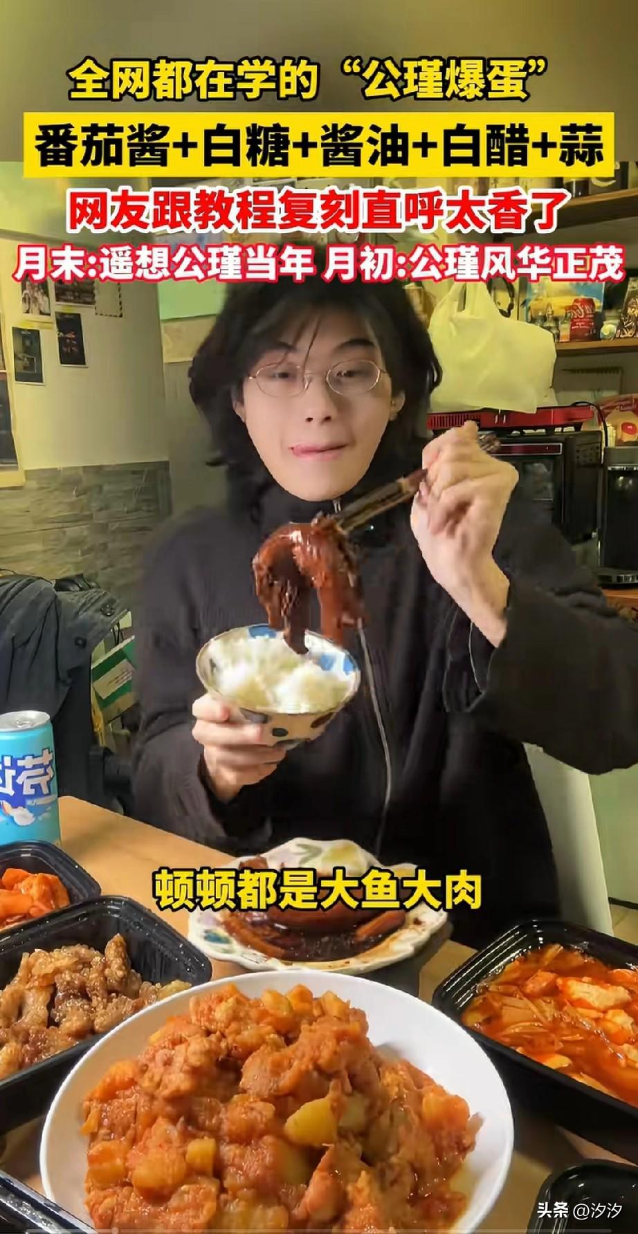 意大利留学小伙凭借公瑾爆蛋火了, 原来小伙子在意大利留学, 月初的时候都是大鱼大肉, 但是有一盘公瑾爆蛋爱不释手, 那么多菜,大家都看到了这一盘, 月底的时候生活费紧张, 直接秒变米饭先人, 网友一句遥想公瑾当年, 直接将他送上了热搜, 应广大网友的要求, 他直接手把手教大家做公瑾爆蛋, 番茄酱搞里头, 三勺白糖,生抽两勺, 老抽一勺,白醋一勺, 蒜末放进去,在锅里面打三个荷包蛋, 然后将这个料汁调一调,倒进去, 直接就出锅了, 看着色香味俱全的公瑾爆蛋, 他吃的那个香, 全网都在复刻, 有人做了之后表示真的很香, 小伙子凭借分享这个美食直接爆火, 大家要不要试试这个美食?