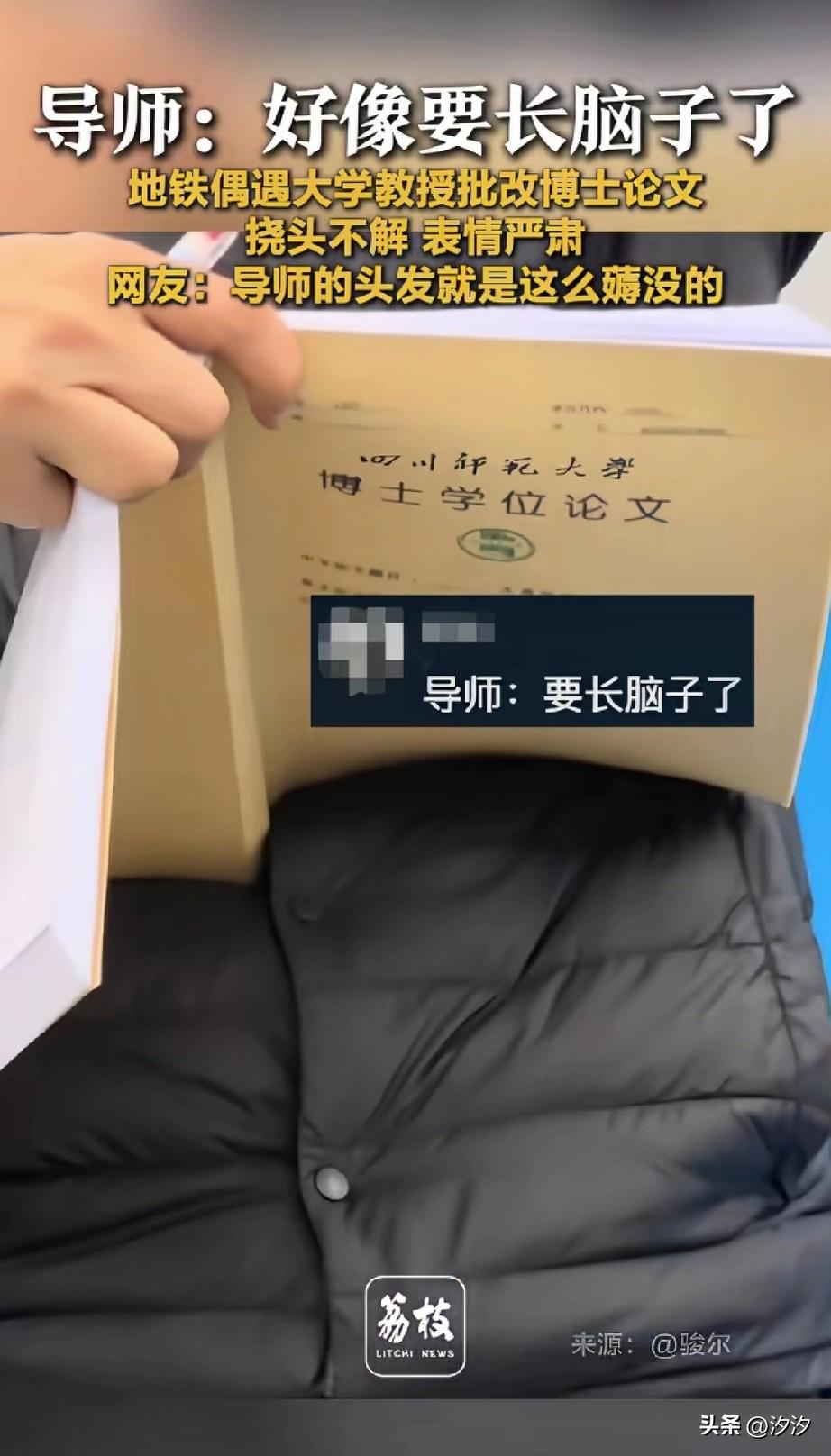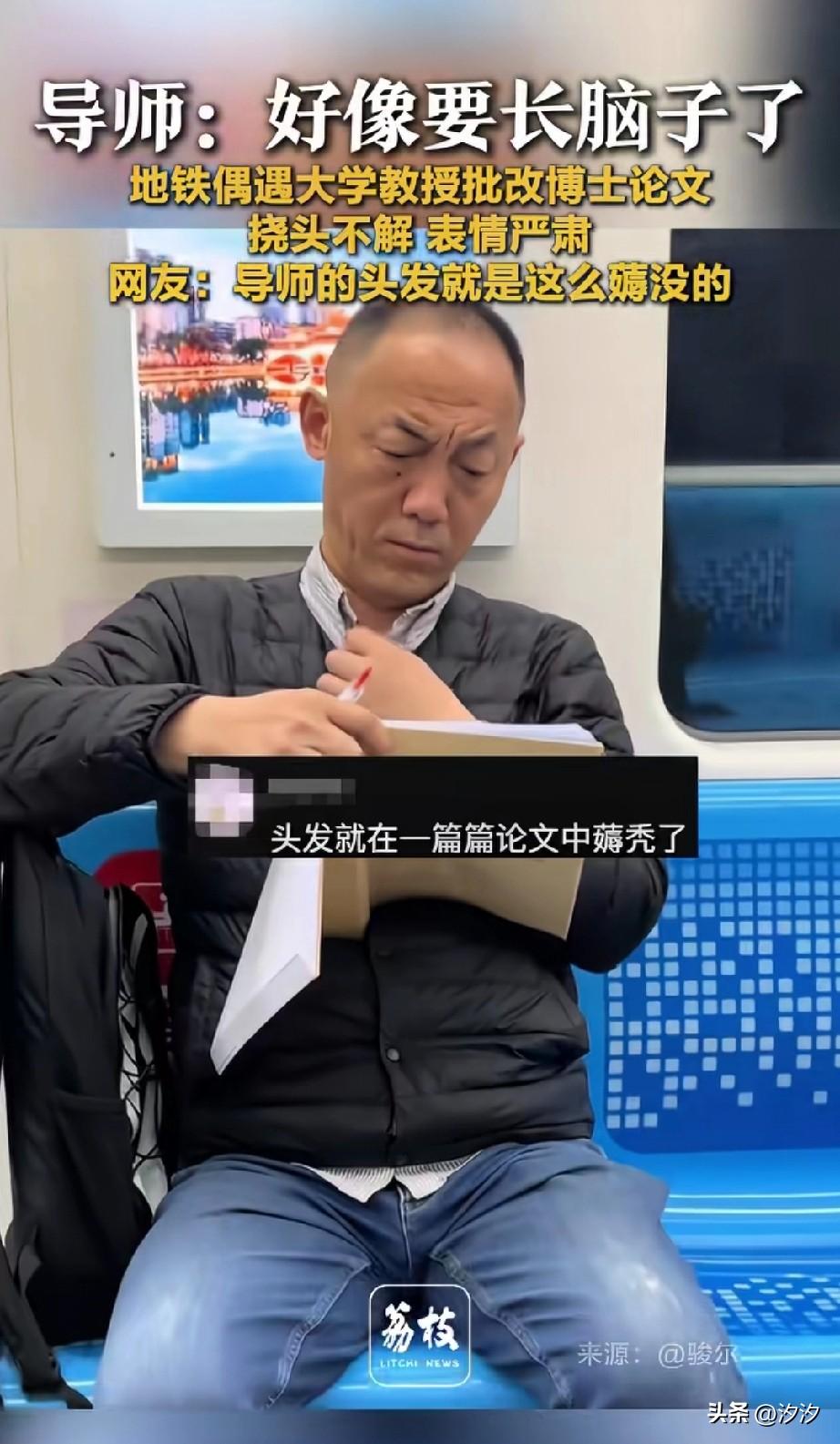 网友坐地铁遇到了这一幕, 一位年龄大的老者拿着博士论文, 一看就是老教授在批改他的学生作业, 不停的挠着头, 心里肯定在想要长脑子了, 看他坐立不安, 一定是论文的内容让他头疼, 一会拉拉一斤,一会拽拽衣袖, 看着他这么难受, 就知道当博导不好干, 这样的老师反而是最负责任的人, 大家遇到过这样的好老师吗?
