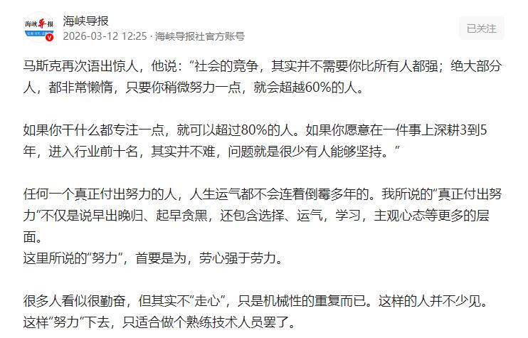 马斯克再次语出惊人,他说:“社会的竞争,其实并不需要你比所有人都强;绝大部分人,都非常懒惰,只要你稍微努力一点,就会超越60%的人。 如果你干什么都专注一点,就可以超过80%的人。如果你愿意在一件事上深耕3到5年,进入行业前十名,其实并不难,问题就是很少有人能够坚持。” 很多人看到这话都不信,觉得马斯克站得高、说话不腰疼,普通人哪那么容易超越别人、进行业前十。 其实这话一点不夸张,先说说最基本的:你稍微努力一点,就能超过60%的人。有人可能会说,我天天上班,怎么没觉得超过别人? 其实这里说的“懒”,不是说不干活、好吃懒做,更多是敷衍着干活、安于现状,得过且过,不愿多花一点心思。 就说我们身边的人,不管是上班的,还是做杂活的,大多都是只求把事做完,不求做好。比如单位里的文员,领导安排啥就做啥,不催就不主动,做完也不检查。 小区里的保洁,有的只扫表面,角落的垃圾不管,而有的人多花点心思,把角落扫干净,就比大多数人做得好,也更容易被认可。 中老年人也一样,退休后有的天天刷手机、打麻将,混日子;有的稍微努力点,每天散散步、学个手工,日子就比别人充实,这就是稍微努力的力量,不用拼尽全力,比别人多用心一点,就能超过一大半人。 再说说专注,做什么都专心一点,就能超过80%的人。现在很多人做事情三心二意,手里做着这个,心里想着那个,看着忙忙碌碌,其实啥也没做好。 比如开小吃店的,有的老板又卖包子又卖面条,每一样都做得一般,生意不好;有的老板就专心做一样,把包子做好,慢慢就有了很多回头客,生意比别人好太多。 还有就是做事情专心一点,不三心二意,就比80%的人做得好。比如中老年人学手机,有的又想学发微信、又想学网购,学了半天也不会;有的专心先学发微信,学会了再学别的,很快就熟练了。 最关键的一点,在一件事上踏踏实实干3到5年,进行业前十不难,难的是坚持。很多人觉得行业前十遥不可及,其实不是能力不够,是没坚持下来。 我们身边就有这样的人,开早餐店的,坚持做三五年,保证食材新鲜、味道不变,慢慢就成了周边最好的早餐店。 做家政的,坚持把服务做好,三五年下来,客户越来越多,口碑也越来越好,就成了行业里的佼佼者。 为啥没几个人能坚持?不是事情难,是大多人急于求成,遇到一点困难就放弃,看到别人做别的赚钱就转行。那些能坚持三五年的,不是比别人聪明,只是比别人有耐心、能坚持。 其实马斯克的话,核心就是告诉我们,社会竞争,拼的不是天赋,是努力、专注和坚持。 我们不用比所有人都强,只要比身边大多数人多一点努力、多一点专注、多一点坚持,就足够了。