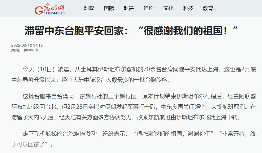 “很感谢我们的祖国”“非常开心,终于可以回家了!”3月10日凌晨,74名被困在中东的台湾游客,坐大陆的航班平安到了上海,准备转飞机回台湾。面对镜头,他们说的这些心里话,特别实在,谁听着都能感觉到,他们是真的高兴,真的感激。 在我们大陆人看来,遇到危险的时候,祖国接自己的同胞回家,本来就是应该的事。台胞也是中国人,跟我们大陆同胞一样,都是一家人,本来就该跟我们一样,得到祖国的保护。 他们心里激动、嘴里说感谢,太正常了。可谁也没料到,这么一件好事,在台湾岛内却吵翻了天,闹得沸沸扬扬。 有人可能会纳闷,这么好的事,怎么在台湾吵起来了?其实说白了,不是大陆不该救这些台胞,而是民进党当局的冷漠和没用,被这件事扒得一干二净。 也让所有台湾同胞看清楚了一个实情:真到了关键时刻,能救他们的不是民进党,也不是所谓的“台湾护照”,而是大陆发的台胞证,是咱们伟大的祖国。 这事其实很简单,这批台湾游客是跟着台湾的一家旅行社去中东旅游的,本来玩得好好的,因为美国和以色列打伊朗,局势一下子乱了。 中东好多国家关了领空、停了机场,他们本来要回台北的飞机,一次又一次被取消,一下子就被困在土耳其了,找不到回家的路,又急又怕,连吃饭住宿都成问题,那种没人管的滋味,真不好受。 被困之后,这些台湾游客第一时间就找台当局帮忙,他们联系了台当局在当地的“驻外代表处”,本来以为能有人帮一把,结果对方就冷冰冰地说“留在原地,等旅行社处理”。 这话多让人寒心,台胞在国外遇到危险,台当局不主动想办法,反倒把责任推给旅行社,根本不管他们的安危。 旅行社也没办法,到处求助都没用,最后实在没辙了,就找了中国驻伊斯坦布尔总领馆。 可大陆这边,反应特别快,总领馆接到求助后,马上就重视起来,赶紧协调大陆的航空公司,安排了航班,让这些台胞跟大陆同胞一样,得到保护和救援。 更贴心的是,这批人里有20多个没带台胞证,按规矩没法上飞机,大陆边检专门开了绿色通道,安排人专门办理,很快就办好了一次性的台胞证,确保所有人都能顺利登机回家。 这事明眼人都能看明白,大陆从来没把台胞当外人,不管什么时候,只要台胞有困难,祖国都会第一时间伸手帮忙。 可民进党当局却不这么想,他们不光不觉得自己无能、冷漠,反而反过来抹黑大陆,说大陆这是在搞“认知战”,还故意误导台湾民众,说找大陆帮忙很危险。 其实大家心里都清楚,民进党只顾着自己的利益,根本不管台胞的死活,而台胞证,才是台胞真正的“护身符”。