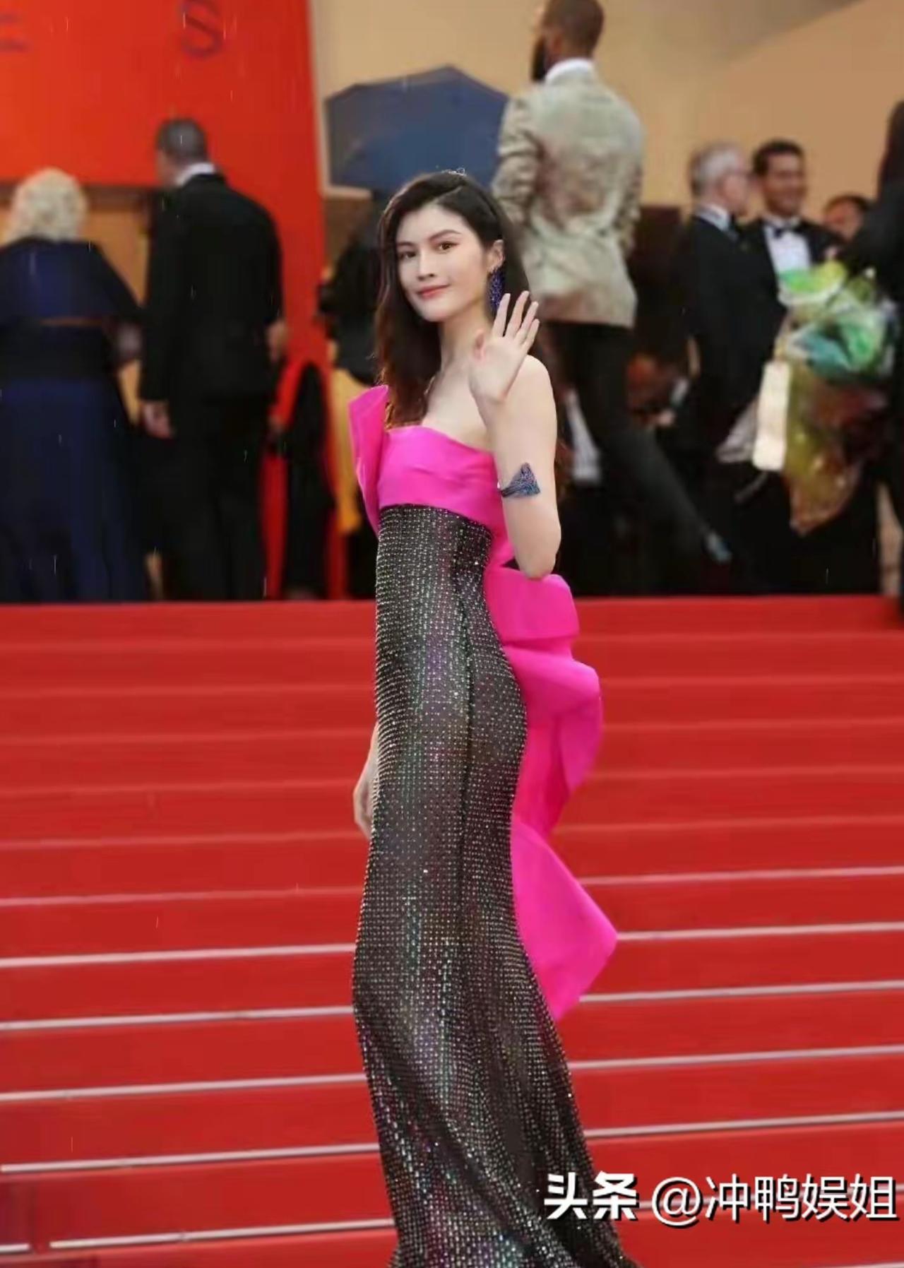 不愧是国际超模,何穗随意摆个 pose 便是全场焦点,气场十分强大。 何穗身着的这件春夏高定玫红拼接透视鱼尾裙,着实亮眼。 薄纱面料将她那纤细的身材展现得淋漓尽致。 说实话,何穗除了拥有雪白的肌肤和 178 的身高优势外,身材比例其实较为普通,不过当然比“大表姐”刘雯好看。