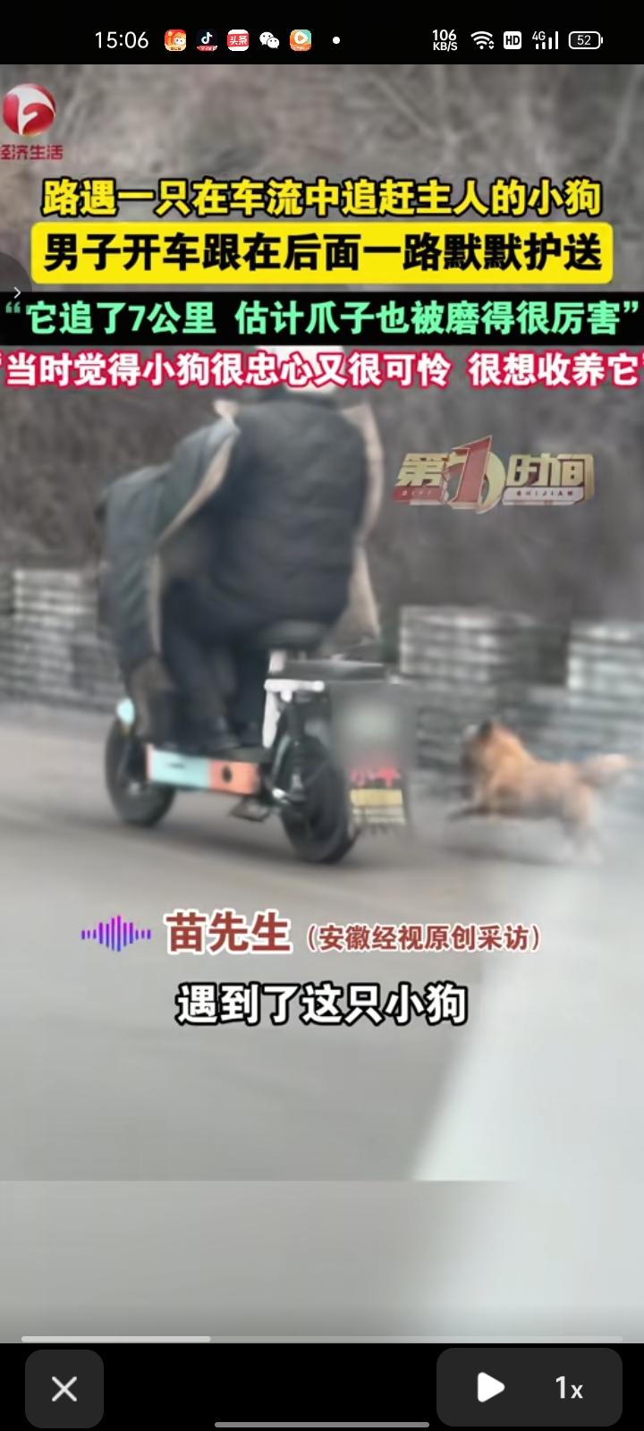 3月7日,山西阳泉。网友晒视频称,路上偶遇车流中追赶主人的小狗,自己则开车在后面默默护送,这狗还是曾投喂过的。 苗先生称,他们两次遇到这只狗,后来和狗主人沟通得知,小狗每天以这种方式跟着主人上下班,这就是他们的生活方式。小狗一路追了七公里,估计爪子磨的很厉害,当时觉得小狗忠心又可怜,很想收养它