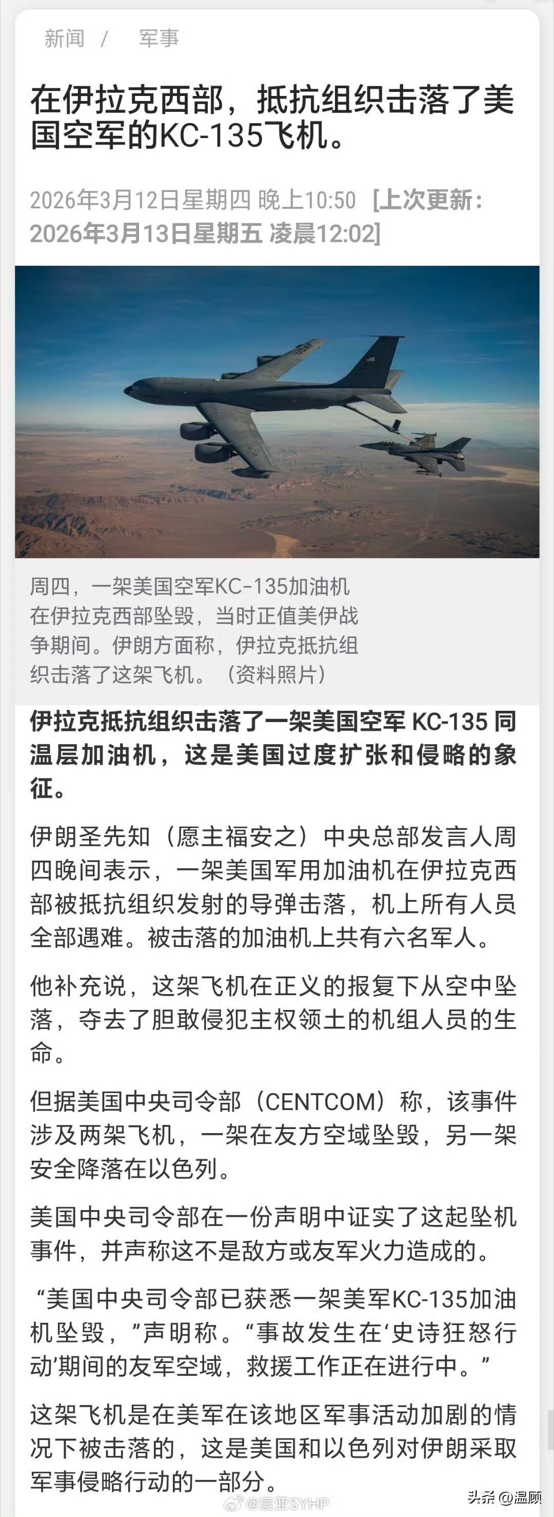 伊朗宣布:伊拉克民兵用防空导弹击落美军KC-135加油机。 美国媒体曝:机上6人死亡。 五角大楼却坚称:两机空中相撞,纯属意外。 反正在美国空军嘴里: - F-18被打下来:意外事件 - F-15坠毁:友军误射 - KC-135爆炸:空中碰撞 - MQ-9无人机被干:技术故障 - 福特号出问题:洗衣房着火 总结就一个逻辑: 美军永远不会有交战伤亡, 所有损失全是“自己人坑自己人”。 KC-135标准机组明明只有4人, 结果死了6个——多出来的人, 难道是上去“围观相撞”的? 伊朗敢打敢认, 美国死不承认、拼命找补。 这就是所谓世界第一强军? 输了战场,还要输体面。