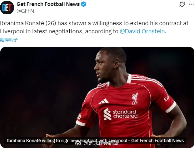 TA记者DO消息,科纳特愿意和利物浦续约,这名26岁中卫当下的合同即将到期,而相关谈判正在进行中。