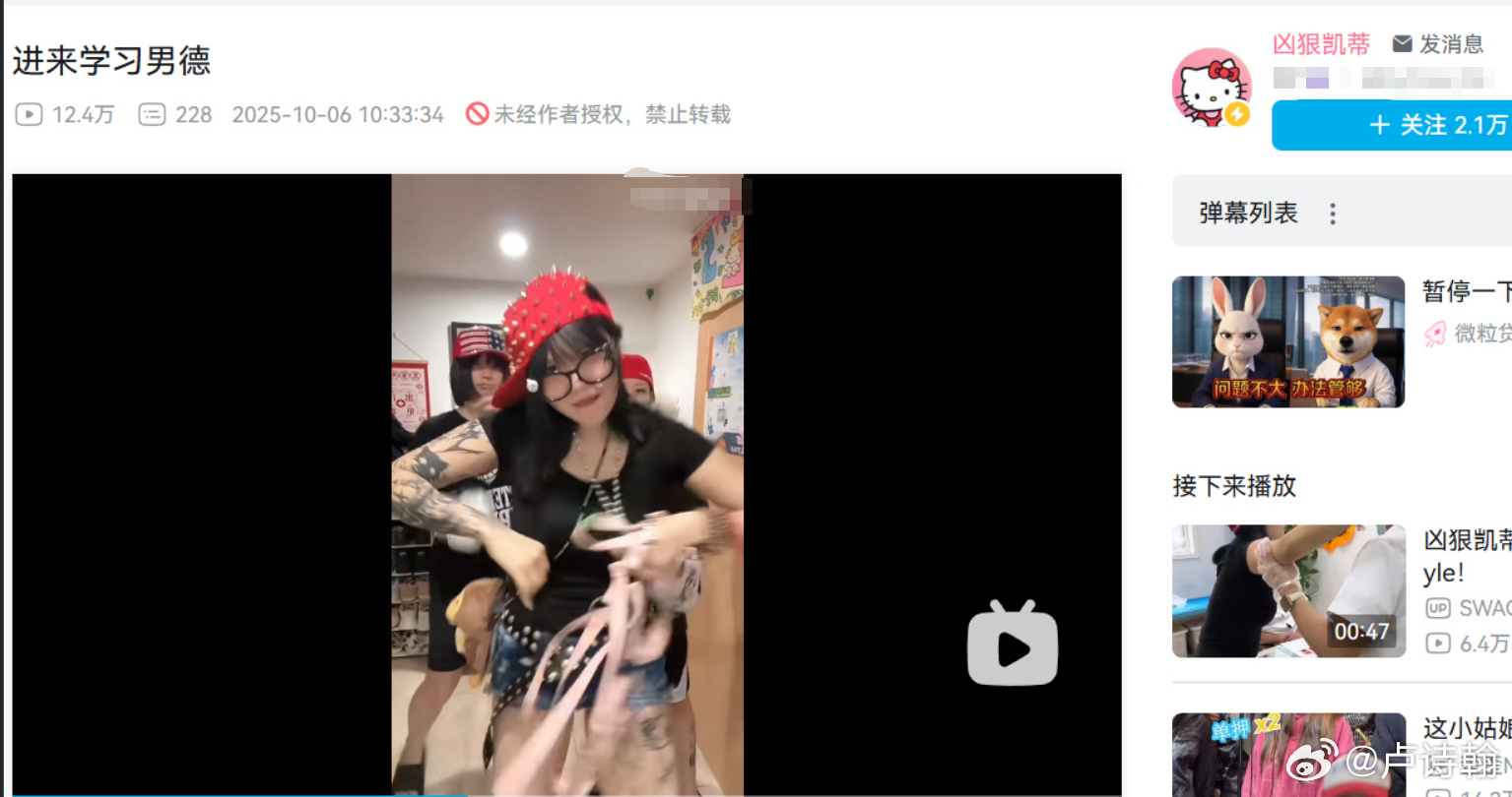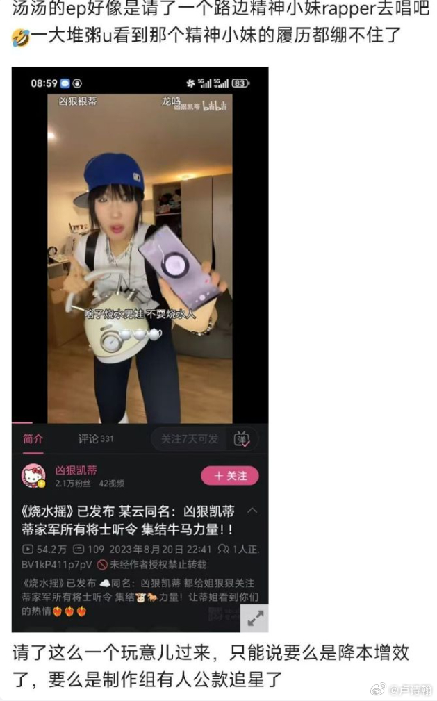 然后冲的时候,大家又挖掘出来,这位叫“凶猛凯蒂”的rap歌手,并不算业内知名rap,更接近一个精神小妹类型的网红,打拳纹身抽象土味无一不缺,之前的代表作叫《烧水摇》《香香瑜伽裤》~