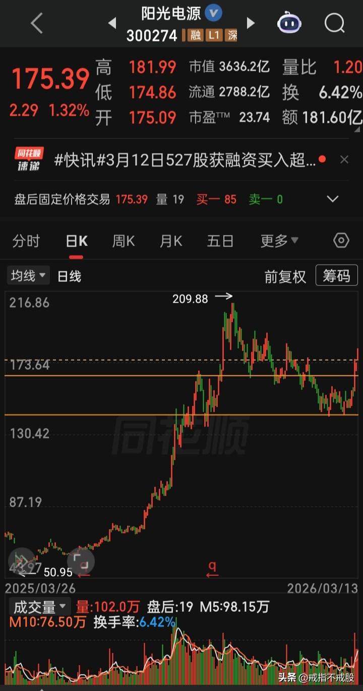 【每日观察2026.03.13】美以对伊中东战火第14天中,在总成交额24173亿比上个交易日缩量433亿、上涨1502家下跌3828家、涨停68家跌停22家的情况下,谁在成交额前十 华工科技194.54亿,跌7.20%(连续第二登陆榜首) 阳光电源181.60亿,涨1.32% 新易盛 159.13亿,涨4.03% 中国能建144.12亿,跌1.58% 宁德时代142.01亿,涨0.38% 中国电建127.76亿,涨停 金凤科技125.35亿,涨0.45% 东山精密118.88亿,涨1.49% 中陆旭创114.83亿,涨1.35% 沪电股份104.17亿,涨6.34%