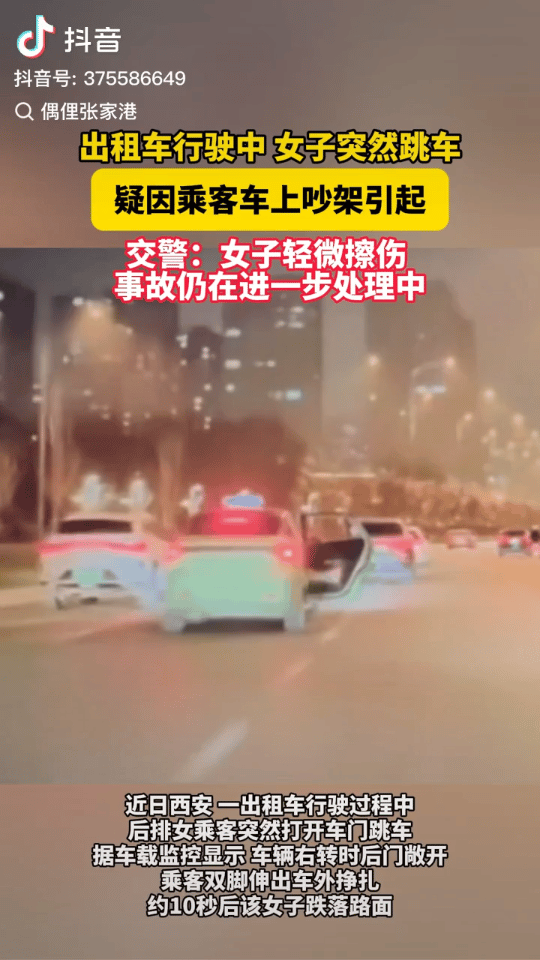 够彪悍的!西安一名女子,从一辆正在行驶的出租车中,突然打开车门要跳车,由于车辆尚未停稳,险些轧到女子头部!网友:真是不怕死,可别害人家司机啊! 视频中,行驶中的出租车后排车门突然被打开(车辆亮起双闪、疑似减速),—双脚往外挣扎着,紧接着一个女子就跳了下来,摔倒在地。 车子靠边停稳后,后排下来一男子查看女子情况。 目前,女子送医检查后确认仅表皮擦伤;警方已立案,初步调查,跳车系车内一对情侣激烈争执所致, 后期将重点核实争执细节,车辆安全装置状态及司机操作合规性。 网友:这女子脑子有病吧!说跳就跳,司机已经反应够快了,真够倒霉的! 小编认为,女子不仅害了他人,而且为了一个男人要死要活的,更是蠢得要命!没人有义务为你的生命负责,能负责的只有你自己!