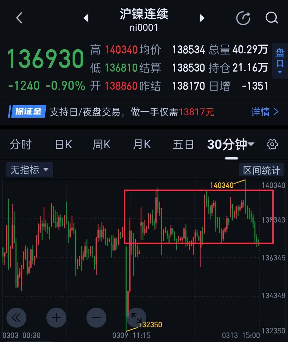 沪镍,可远观而不可亵玩焉。 沪镍,目前走势依然是维持图(1)的区间震荡。在没有效突破区间的压力或支撑前,最好是以观望为主(或更换赛道)。如进场时机选择不好,容易成为多空争斗的牺牲品。 具体操作上,夜盘137010能否有效站稳是关键。站稳,暂用图(2)中枢震荡的视角观察走势的生长。若不能站稳,沪镍短期仍有向132350寻求支撑的可能。当下如寻找买卖点,不用急于一时。可等围绕图(2)中枢形成三买或三卖后再进场操作 。