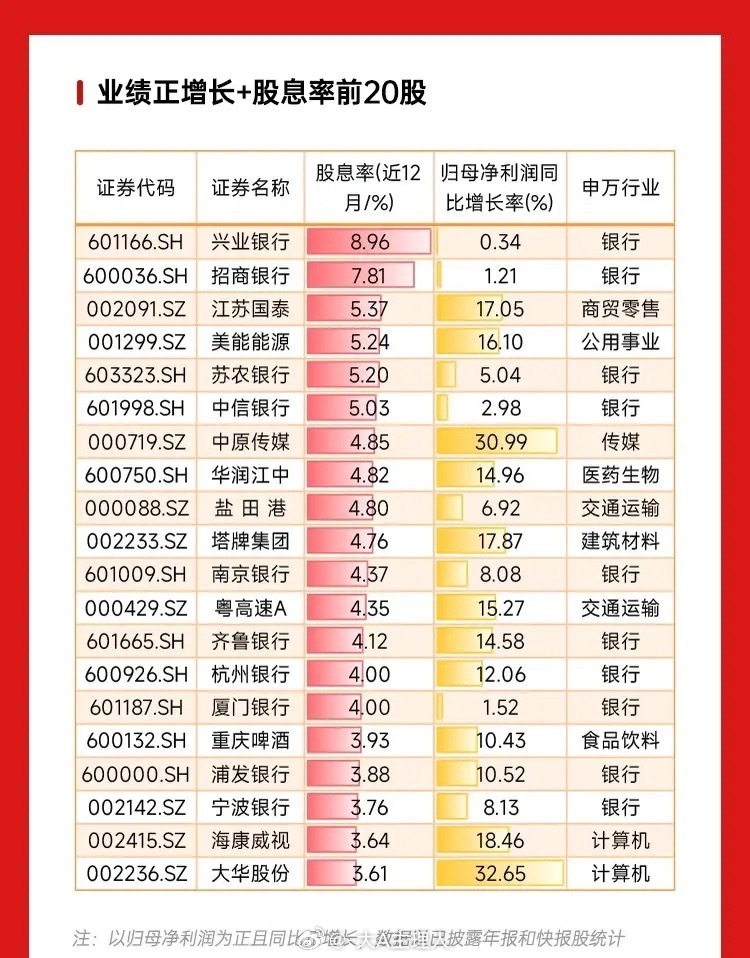 🔥高股息+业绩双优!20只业绩正增长+股息率TOP20名单出炉,银行股霸榜,兴业银行股息率近9%,招商、中信等大行领衔,还有传媒、交运等赛道优质标的。