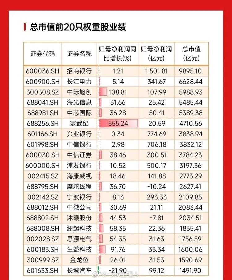绩优+高成长+低估值+权重龙头名单出炉,年报季深度扫描!业绩增速榜TOP20股、总市值前20权重股业绩、增速超20%+PE不足20倍股、周期与大金融增速超20%+PB较低股、业绩正增长+股息率前20股五大维度全梳理!