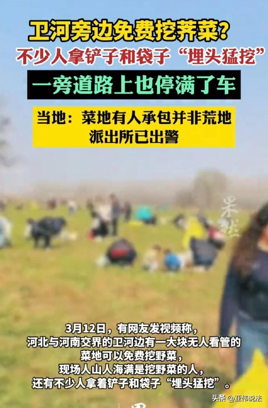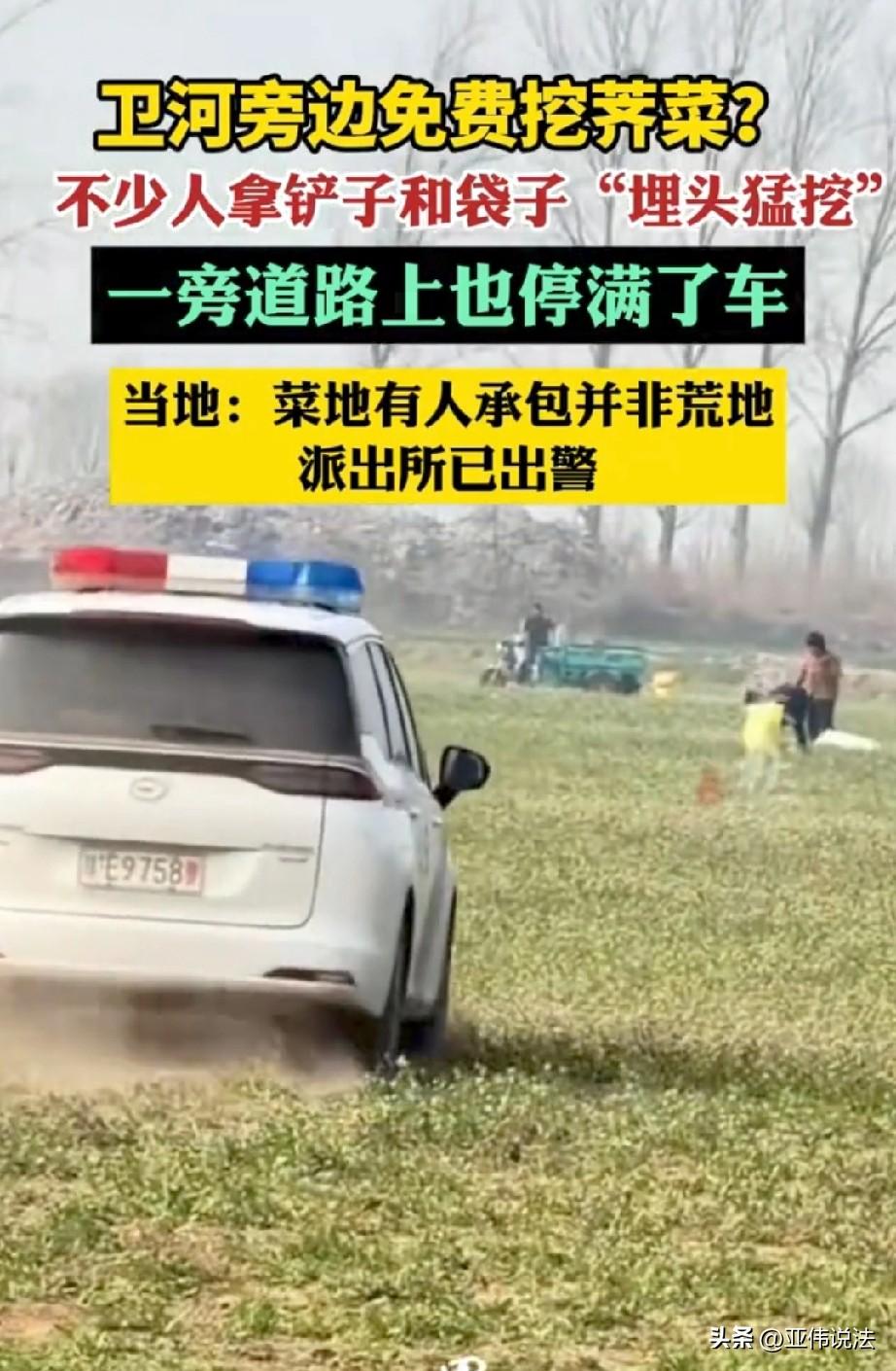 明抢?河南,一男子见地里的荠菜长得正旺,他以为没人看管,可以随便挖,便拍了条视频发到网上。没想到一下就火了,大家都提着袋子,拿着铲子过来埋头猛挖,准备回去包饺子,一时间,地里人头攒动。谁知,就在大家挖得起劲时,警车赶到,将众人驱离。原来,这片地根本不是无人看管,是人家承包的,足足200多亩,因为一条视频面目全非,承包人欲哭无泪。 3月12日,河南与河北交界处的某个村子,上演了一幕现实版的野菜大战。 事情还得从网上的一条视频说起。有人发消息说,卫河大堤旁有一大块菜地,没人看管,地里的荠菜长得正旺,随便挖。 这消息一出,就像长了翅膀,很快在附近传开了。 起初,只有零星几个人带着袋子过来,可一传十、十传百,到了3月12日上午,场面已经控制不住了。 一位路过的小伙子被眼前的景象惊呆了,河堤上密密麻麻全是人,男女老少都有,手里拿着铲子、铁锹,甚至有人扛着编织袋,弯着腰在地里埋头猛挖。 路边的私家车停了一长溜,不知道的还以为这儿办集市呢。 男子觉得这新鲜事,肯定有流量,便随手拍了视频,发到了网上。 地里那些嫩绿的荠菜,正是包饺子的稀缺野味,不少人专程赶来,想着反正没人管,多挖点回去,好好吃几顿。 大家的想法也差不多,好不容易来一趟,都提着大袋子,挖得不亦乐乎。 可这热闹的场面,没持续太久,3月12日下午,竟然有人报了警。 很快,警车闪着灯开到了现场,开始劝导大家离开。 正挖得起劲的人们心里满是疑惑,这不是野地吗,怎么警察还管? 原来,事实并非网上传的那样。 村书记解释说,那块地虽然在导航上显示是北善村,实际上却属于河对岸的河南内黄县马上乡。 更关键的是,这根本不是荒地,而是一户人家承包的荠菜地,足足有两百多亩。 年前因为管理上的疏忽,地里的荠菜没来得及收,这才让人误以为是无人看管的野地。 一开始也就几个人来挖,他们也没在意。结果网上越传越邪乎,人越聚越多。 等承包的人发现时,地里已经被挖得一片狼藉,他一个人又制止不了那么多人,没办法,只能报警求助。 后来,当地派出所工作人员也证实,地是有人承包的,不能随便挖。 至于那些挖过野菜的人,民警到场后只是驱离,没有追究责任。 一位去挖过的网友事后不好意思的表示,早知道是人家种的,他肯定不去,不过现在说什么也晚了。 一条谣言点燃一场闹剧,两百多亩荠菜被哄抢一空,最无辜的是辛苦耕种的承包人。 就因为网上有人瞎造谣,结果呼啦一下来了几百人,把人家承包户200多亩地挖得干干净净。 种点菜多不容易啊,辛辛苦苦干一年,就这么被人霍霍完了,真是又委屈又无奈。 大家跟风挖菜,可能真以为是野地,但源头就是那个造谣的人,为了点流量满嘴跑火车,把好好一片地给毁了。 这种人就该严查严惩,必须付出代价,法律必须站在老实人这边,不能让种地的白白受损失。 《治安管理处罚法》第四十九条规定:盗窃、诈骗、哄抢、抢夺、敲诈勒索者故意损毁公私财物的,处五日以上十日以下拘留,可以并处五百元以下罚款;情节较重的,处十日以上十五日以下拘留,可以并处一千元以下罚款。 众人未经承包人同意,擅自进入他人承包地采摘荠菜,属于以非法占有为目的侵占他人合法财产,即便误以为是荒地,也不改变行为的违法属性。 但民警以劝导驱离为主,未作处罚,属于情节轻微的人性化处理。 若造成较大财产损失或拒不配合,警方可依法给予拘留、罚款等处罚,承包人也可依法要求民事赔偿。