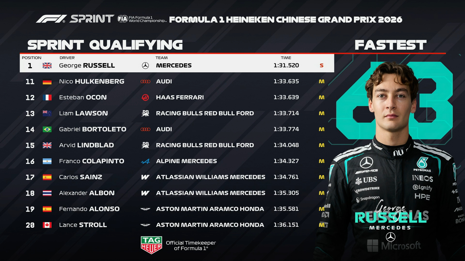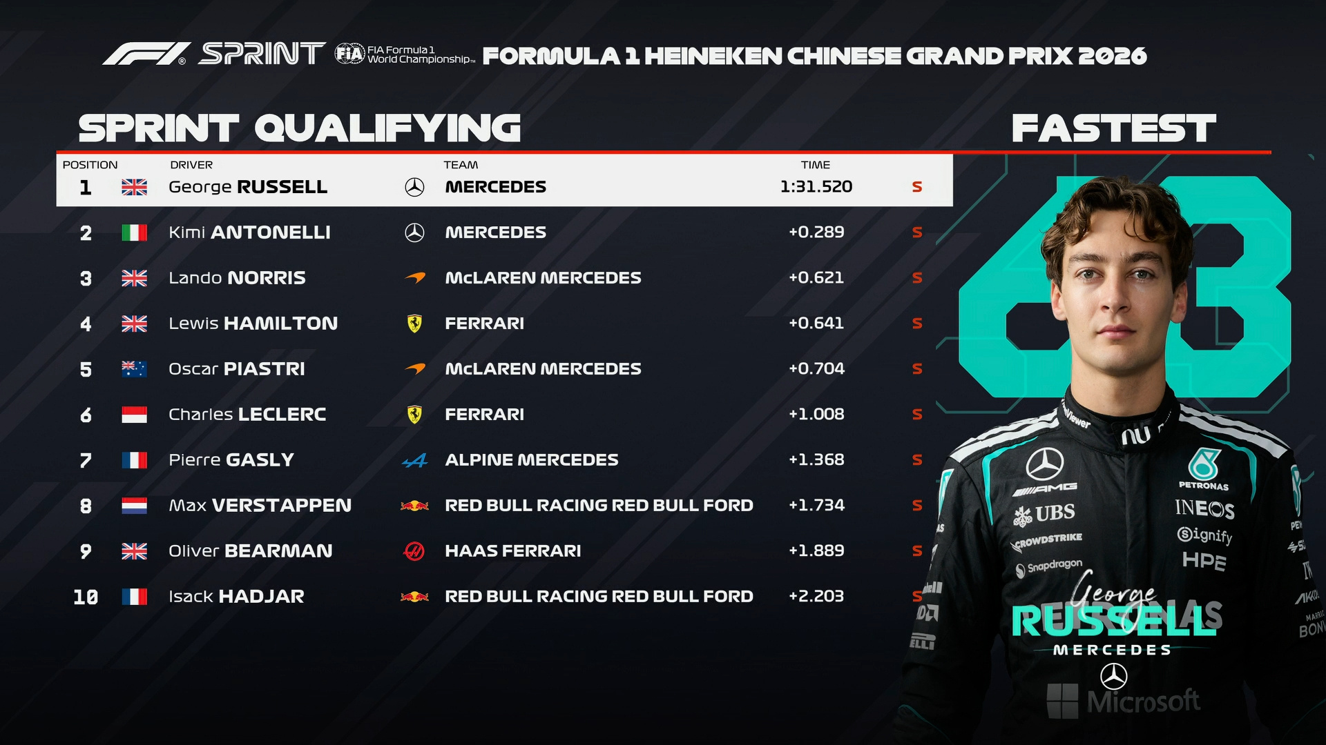 F1中国大奖赛周五冲刺赛排位赛成绩表F12026F1中国大奖赛