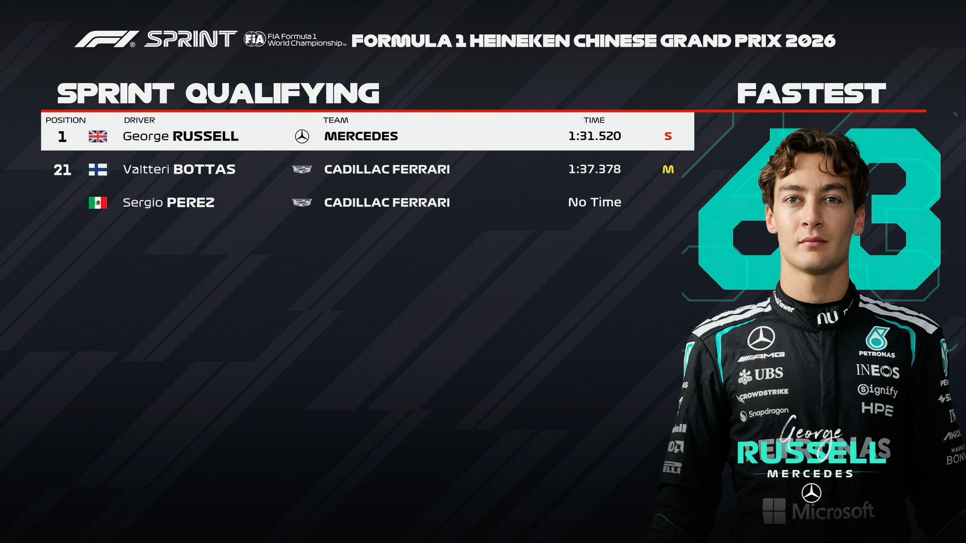 拉塞尔赢得F1中国大奖赛周五冲刺赛排位赛的杆位!安东内利落后0.289秒排名第二