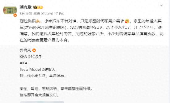新一代小米SU7将于本月发布,有博主发文称,这是BBA 34C杀手,也是Tesla Model 3破壁人。对此,小米产业投资部合伙人潘九堂回应称,别拉仇恨,小米汽车不针对谁,只是顺应时代和用户需求。 但他同时表示,家里之前经常开德系的年轻人买车,选了小米YU7,开了小半年,很满意。“我们这代人年轻时穷苦,见过的好东西少,不少对传统豪华品牌有执念,现在的消费者更看产品力本身。”
