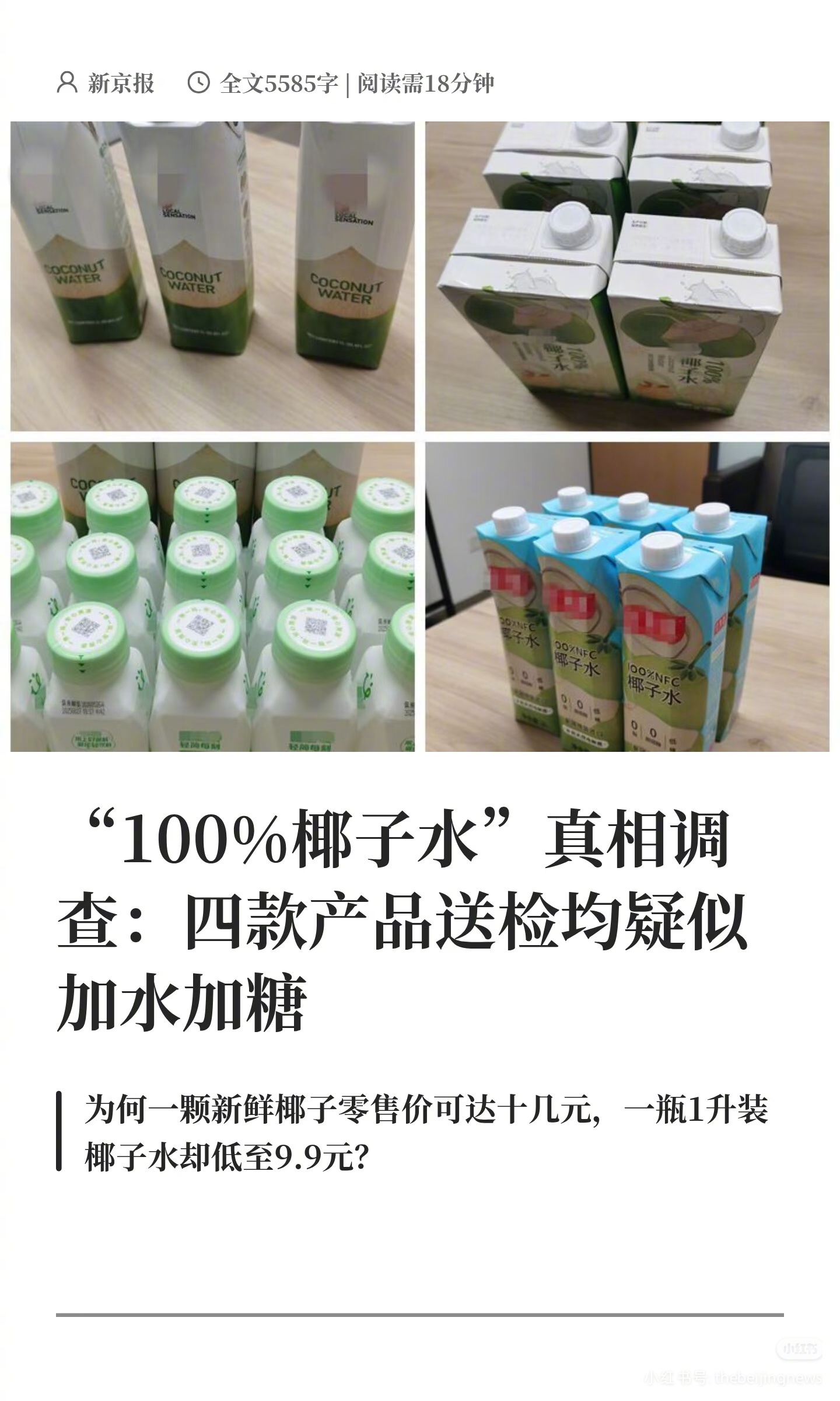 多款100%椰子水被曝兑水加糖 哪些椰子水品牌在坑害消费者,大家可以曝光一下,避个坑。看有椰子水品牌打“100%椰子水”,这与去年被曝光的“0添加”,有什么区别?