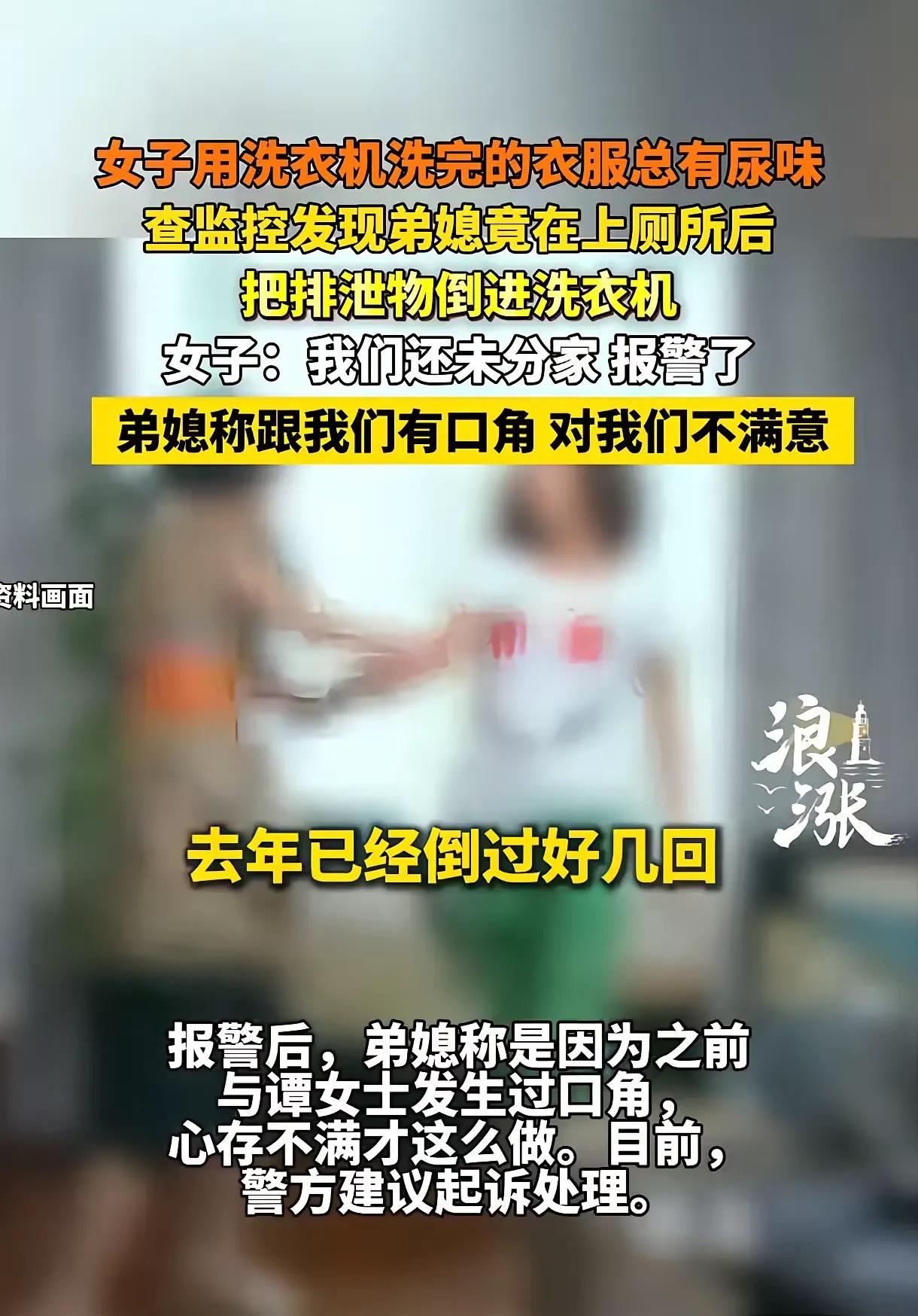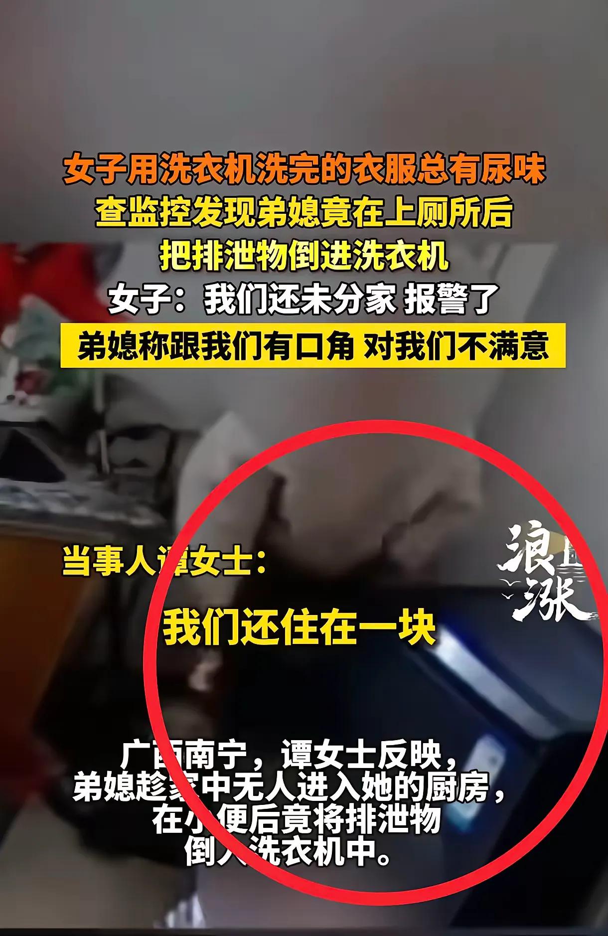 “到底多大的仇恨!” 广西一女子发现刚洗的衣服总有尿味,起初她以为是洗衣机或水质原因,后来又多次发生,女子便起了疑心,悄悄在厨房装了监控,不料拍到弟媳趁家里无人进入厨房尿在容器里直接倒入洗衣机的一幕,女子忍无可忍,果断报警。 监控画面里的场景,任谁看了都会头皮发麻。弟媳端着盛有排泄物的容器,径直走向洗衣机,毫不犹豫地将里面的东西倒了进去,整个过程熟练得让人胆寒。当事人谭女士说,这种情况从去年就开始了,每次洗完衣服都能闻到一股刺鼻的尿味,她换过洗衣液、清洗过洗衣机内筒,甚至怀疑过家里的自来水有问题,折腾了大半年,直到装了监控才揪出真相。 更让人寒心的是,两家人还没分家,住在同一个屋檐下。弟媳被揭穿后,给出的理由仅仅是“之前和谭女士发生过口角,心里不满”。就因为几句拌嘴,就用这种阴损又恶心的方式报复,把家人的衣物当成泄愤的工具,这哪里是家庭矛盾,分明是突破了做人底线的恶意。 报警之后,警方建议谭女士走法律途径起诉处理。很多人觉得“不就是倒了点尿,至于闹到法院吗”,可仔细想想,这件事的性质根本没那么简单。这是长期的、故意的污染他人财物,更是对家人健康的漠视。尿液里的细菌和异味附着在衣物上,长期接触皮肤可能引发过敏、感染,尤其是如果家里有老人、小孩,风险更是难以估量。 这件事撕开了中国式大家庭的一个残酷真相:没分家的亲情里,藏着最隐秘的算计。同住一个屋檐下,抬头不见低头见,矛盾本就容易滋生,可解决矛盾的方式有很多种,坐下来谈、分开住,哪怕吵一架都比这种背后捅刀子的做法强。用这种下三滥的手段报复,不仅解决不了问题,还会把最后一点亲情彻底碾碎,让两家人变成仇人。 有人说谭女士太较真,毕竟是一家人,闹大了不好看。可换个角度想,正是因为一次次的隐忍和退让,才让这种恶意行为持续了大半年。如果一开始就发现苗头及时制止,也不会发展到今天这个地步。面对身边人的恶意,隐忍从来不是解决办法,只有亮出底线,才能保护自己和家人的权益。 这件事也给所有还没分家的家庭提了个醒:再亲的人,也要有边界感。同住时要互相尊重,有矛盾及时沟通,别让小事积成怨恨,更别让怨恨变成伤人的利器。 各位读者你们怎么看?欢迎在评论区讨论。