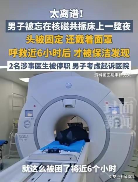 这事儿想想就后怕, 被遗忘在核磁共振设备上长达6个小时,而且还是头被固定住,在上面躺着一夜是多么的煎熬。 先不说这么长时间会吸收多少的辐射,毕竟大家也是谈辐射色变,会对人体造成不可逆的损害,就是躺在设备上一动不动长达6个小时对一般人都是一种煎熬。 像那种有幽闭恐惧症的,在这种环境中几乎不能呼吸,就是普通人经过这么一折腾也会落下恐惧症了。 患者得到的回复是两个医生都把这事给忘了,那也只能说明心太大了!