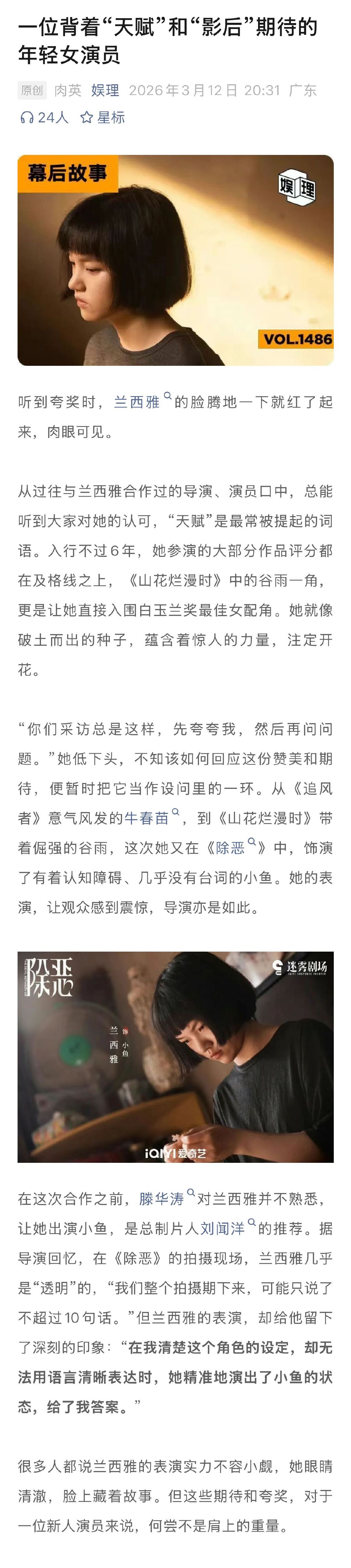 兰西雅担心幼态脸影响角色呈现 兰西雅谈过于夸张的赞赏何尝不是误解 王骁深知《除恶》小鱼的角色难度,“塑造小鱼这个角色很危险,多一分就过了。”拍摄时杀青戏时,兰西雅边跑边哭的情绪表达,让王骁直言“当我看见她哭着蹲在我面前,我突然就觉得心里踏实了。”这些被表演和感受填满的空间,就是剧本留下的缝隙,也是兰西雅希望拥有的“自由”…娱理独家↓