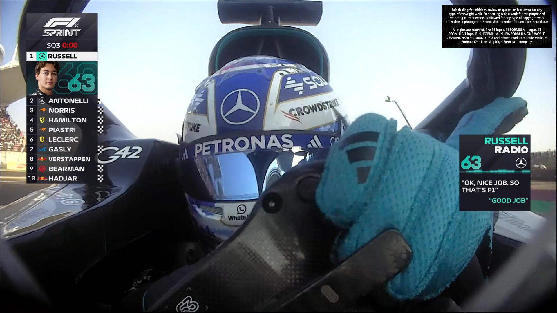 🇨🇳F1中国站唯一的一节练习赛中,乔治·拉塞尔领跑,梅赛德斯车队包揽前二。拉