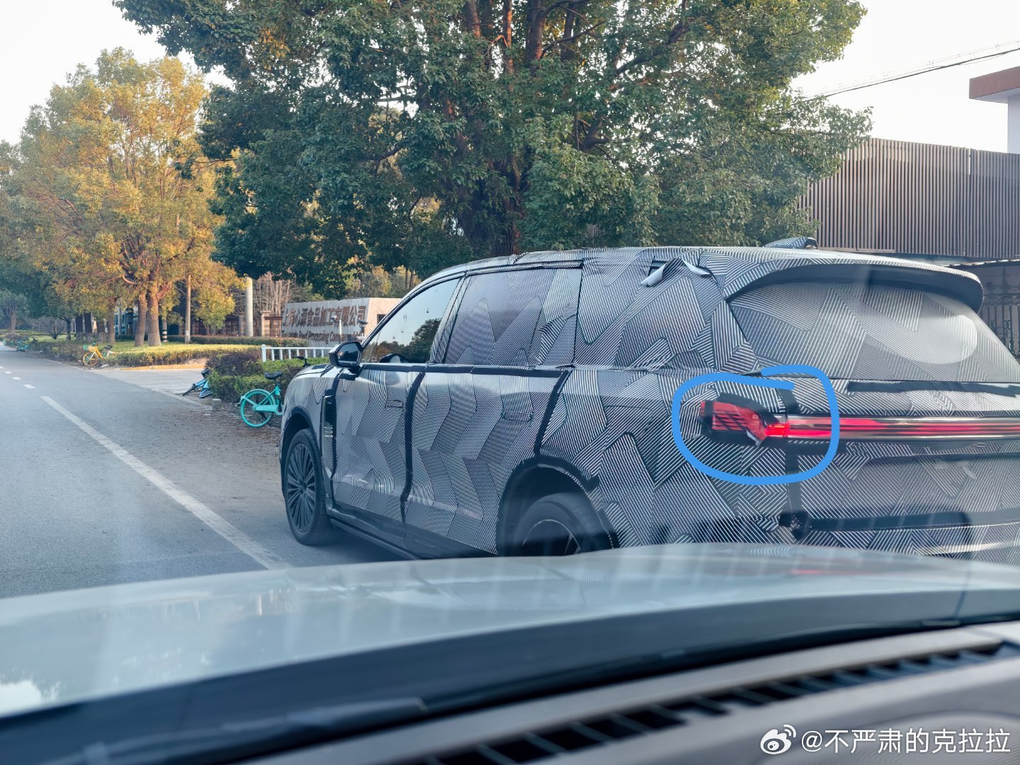 图五 这个尾灯是不是比 ES8 的略宽一些啊?贴着伪装我有点不好分辨太细