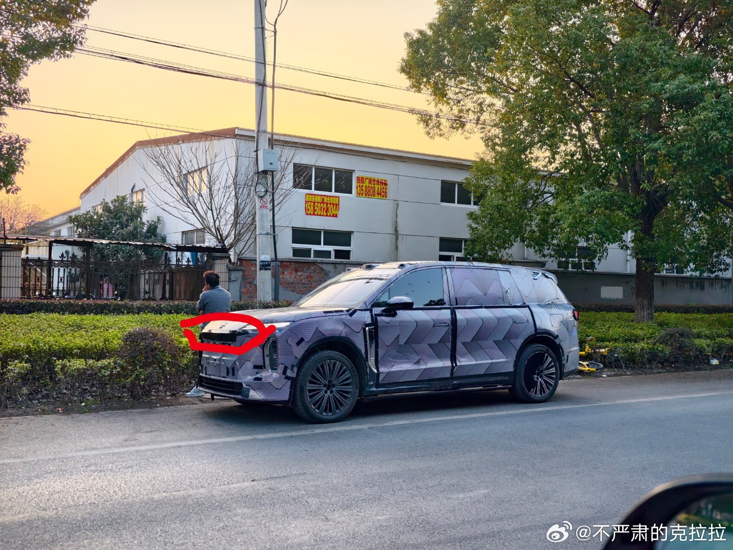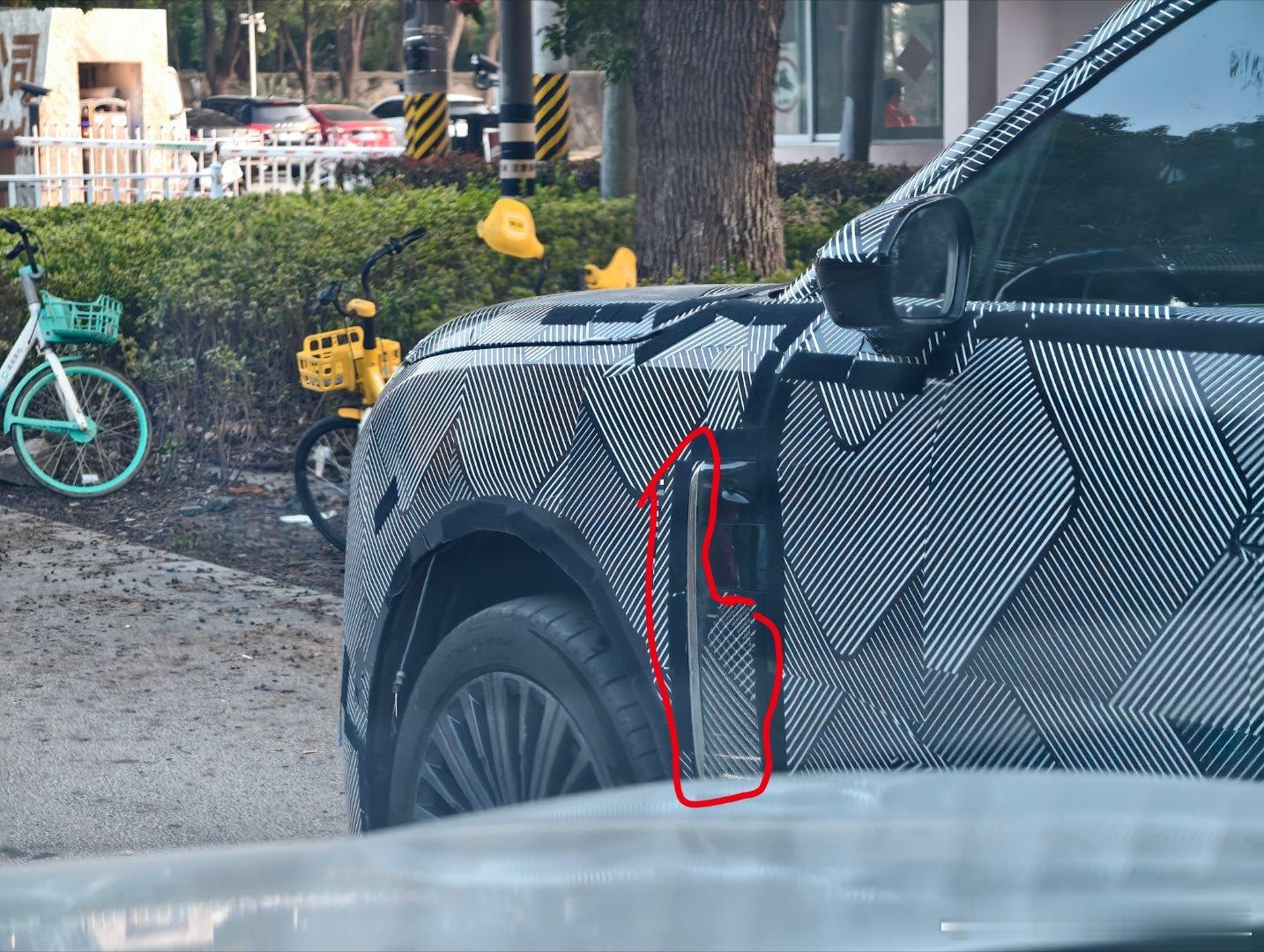 图二 红色我画了两个圈圈一个是侧向激光雷达 这个激光雷达我只能说我肉眼看过去装饰面板比现款 ES8 的要宽一些看起来,还有感觉上这个激光雷达的装饰件用了镀铬?没记错的话,现款都是塑料件是不是?