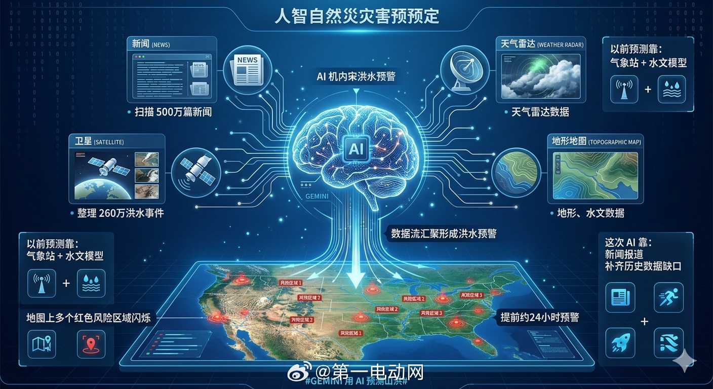 AI开始读新闻预测灾害了 Google 最近做了一件很科幻的事:用 Gemini AI 读了全球 500 万篇新闻,整理出 260 万次历史洪水事件。再结合天气、地形、水文数据,训练 AI 去预测 哪里可能发生山洪。