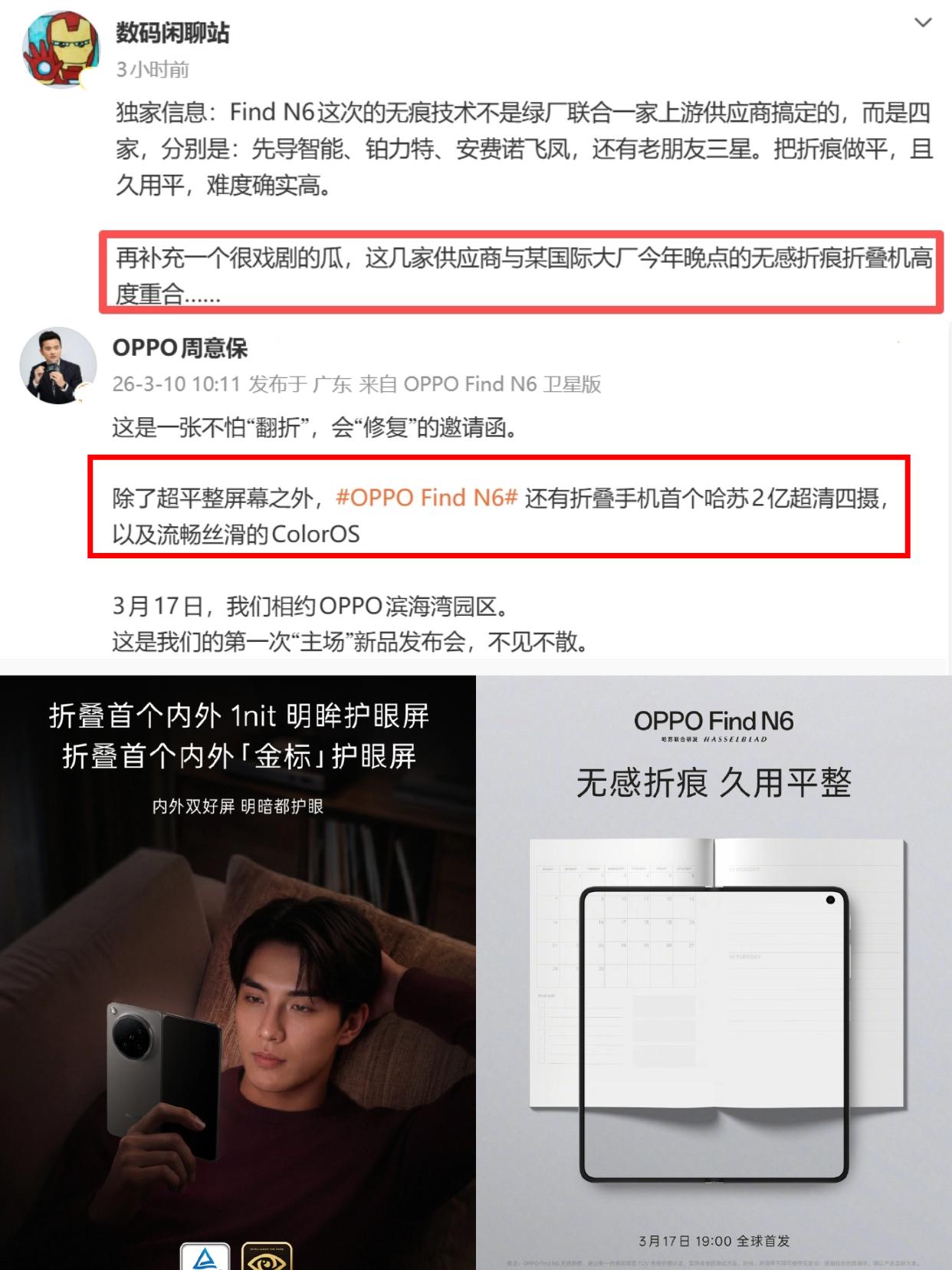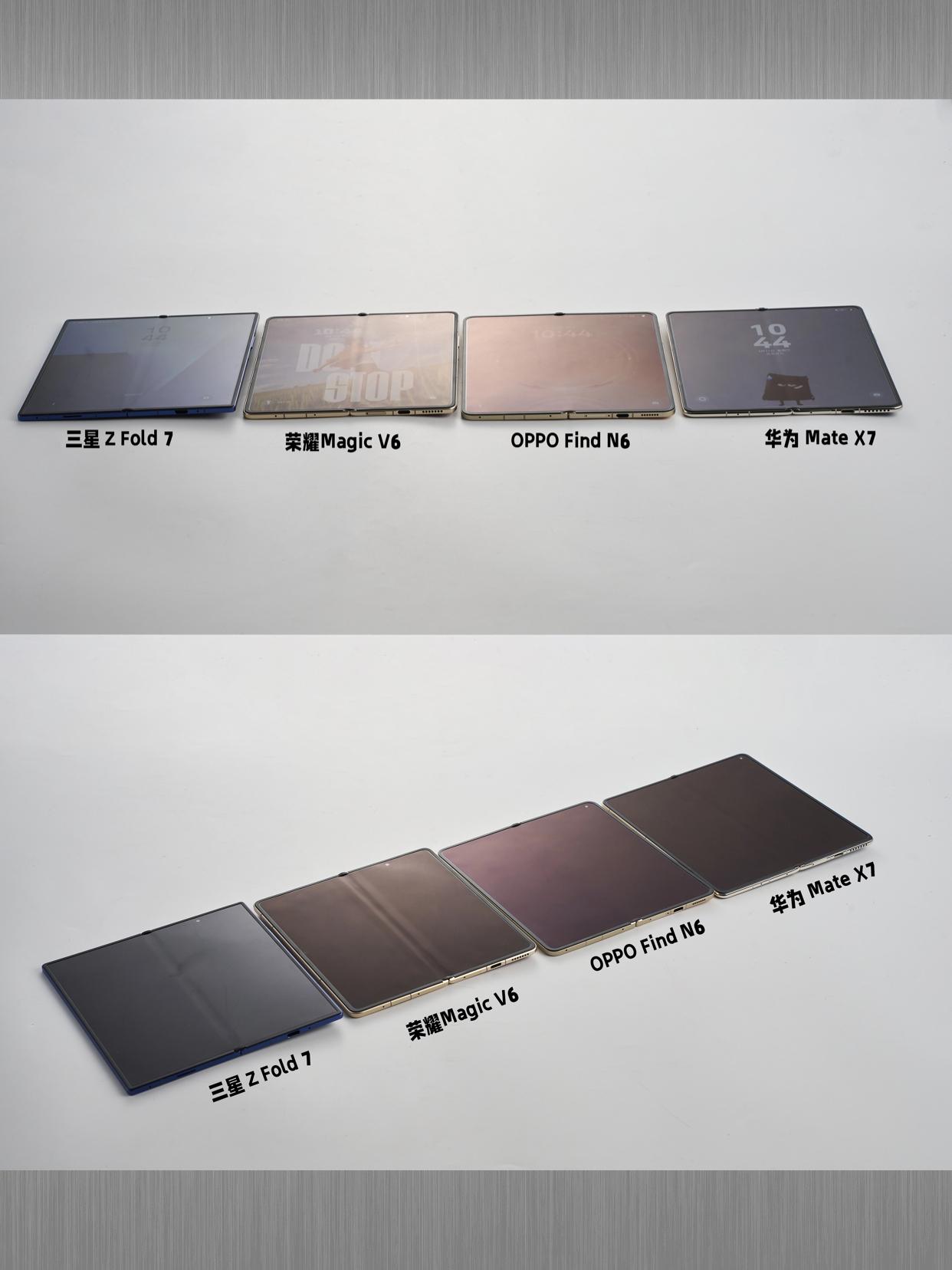 四大折叠屏对比,差距好直观啊... 不对比是不知道,都是折叠屏手机,折痕的效果居然区别这么大? 拿上三星Z Fold7、荣耀Magic V6、OPPO Find N6以及华为Mate X7,实际看看折痕效果,大家觉得谁表现最好? 可以看到,三星这代比前代强多了,折痕浅了一些。荣耀则跟三星差不多,折痕都比较明显。华为则比前面这两款好不少,只看到浅浅一条。而不管是亮屏还是暗屏,OPPO Find N6都几乎看不到折痕,平的就像一整块屏幕一样。 客观来说,OPPO这次是真没在瞎吹的,技术沟通会上就讲了,Find N6是联合了四家核心供应商,首次用上了芯片级高分子3D打印技术,还有天穹记忆玻璃、钛合金天穹铰链等黑科技,才最终实现无感折痕的效果 听说Find N6已经通过德国莱茵实验室的「全球最平整折叠手机」认证,这含金量夯爆了吧?而且它还是折叠屏首个内外 1nit 明眸护眼屏,不仅观感好,久用还更护眼 再加上这次还有全新的AI手写笔,配合ColorOS 16优秀的多窗口交互功能,生产力大幅提升。日常拍照也有折叠里唯一哈苏2亿超清四摄,拍照也不输直板机! 现在看OPPO Find N6就已经很强很全面了,不知道还有没有其它惊喜?就等3月17日发布会了,大家怎么看?
