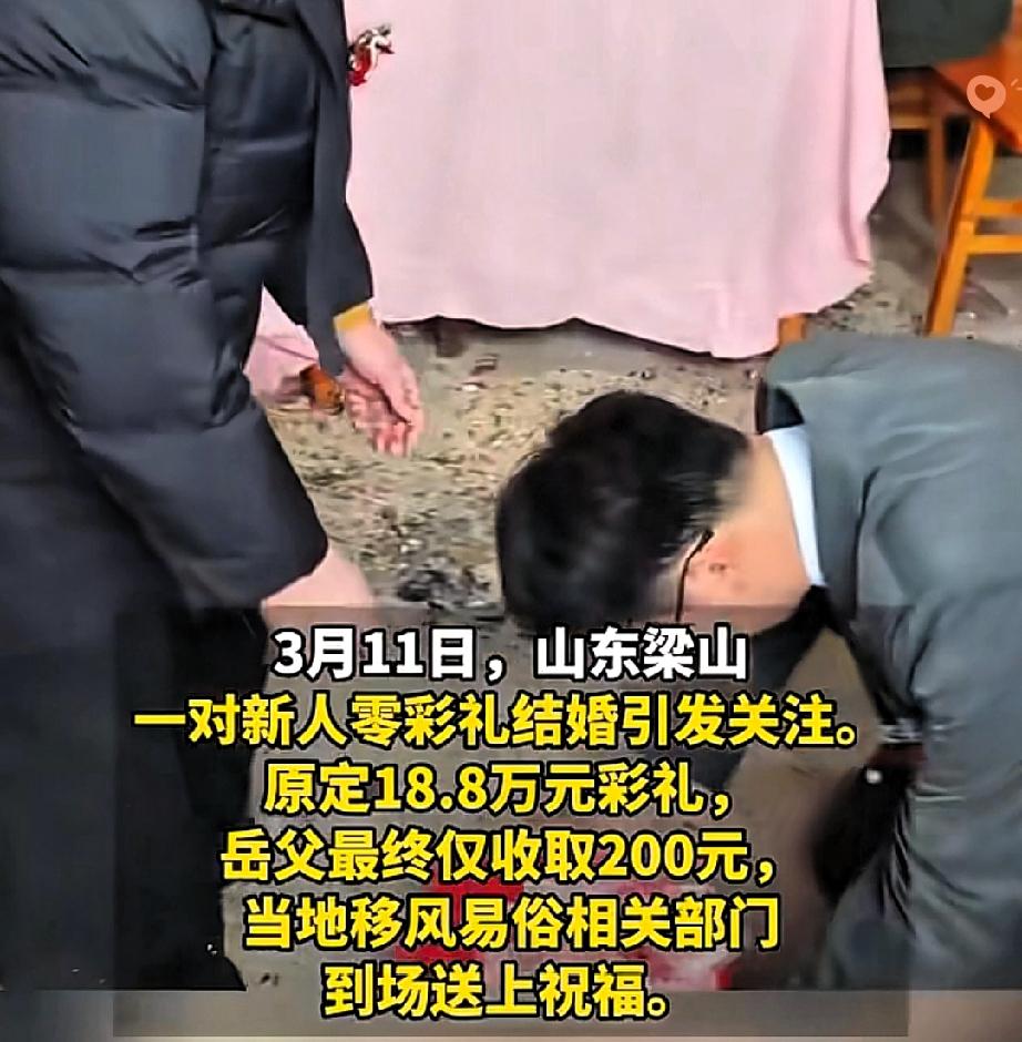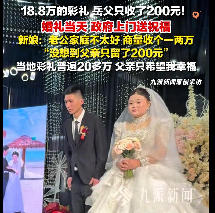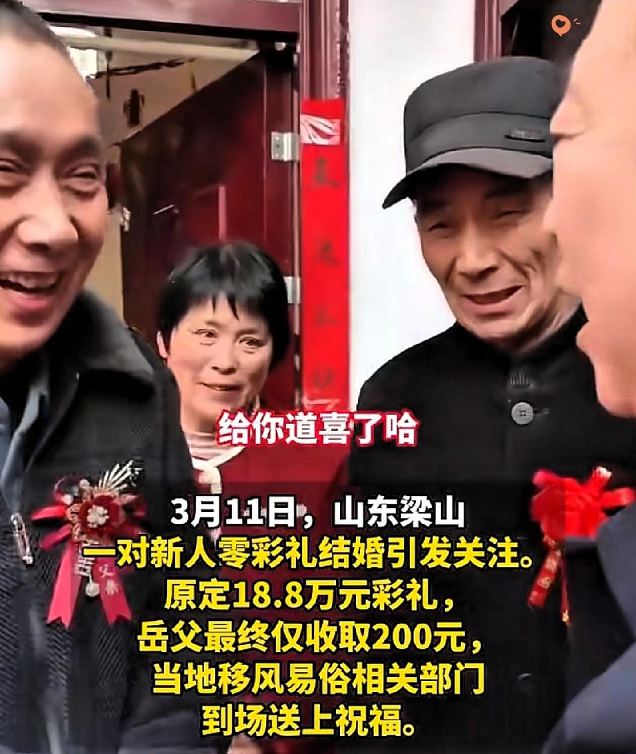 山东梁山这场婚礼太戳心,18.8万彩礼堆桌上,新娘父亲只抽了200块就全退了。 要知道当地彩礼普遍20万起,别人家嫁女儿都往高了要,这位父亲却活得比谁都清醒。 新娘早跟家里商量好收一两万意思下,没想到父亲更干脆,一句“只要你幸福就行”,把所有压力都给女儿卸了。 200块连一桌酒席都不够,却比20万还重。 这哪是收彩礼,分明是给女儿的底气,也是给两个家庭的体面。 当地工作人员带着礼品上门祝贺,说这是婚俗新风的好榜样,真的太赞了。 其实彩礼这东西,从来不是越多越幸福。 数据都显示,彩礼越高离婚率越高,那些把女儿当商品标价的,反而容易把婚姻逼到绝路。 真正的疼女儿,是不让她带着原生家庭的算计嫁过去,不让她的婚姻从一开始就背着债。 你身边有没有这样通情达理的长辈?来评论区说说你的看法~