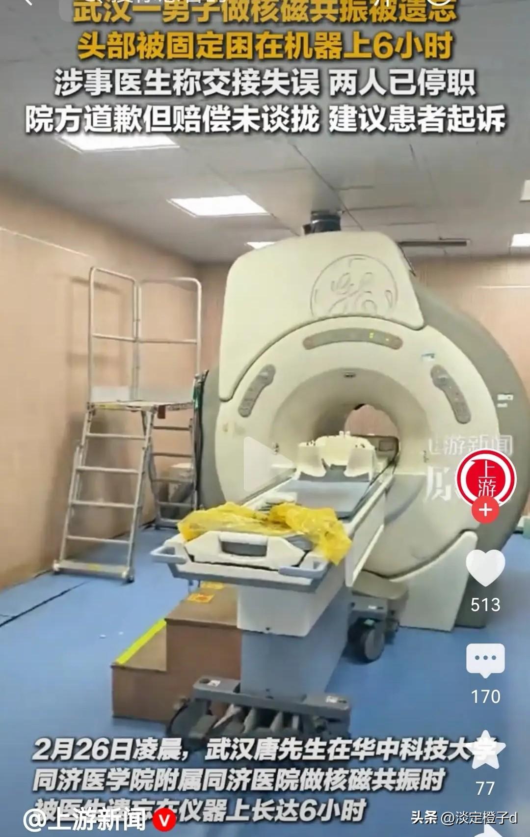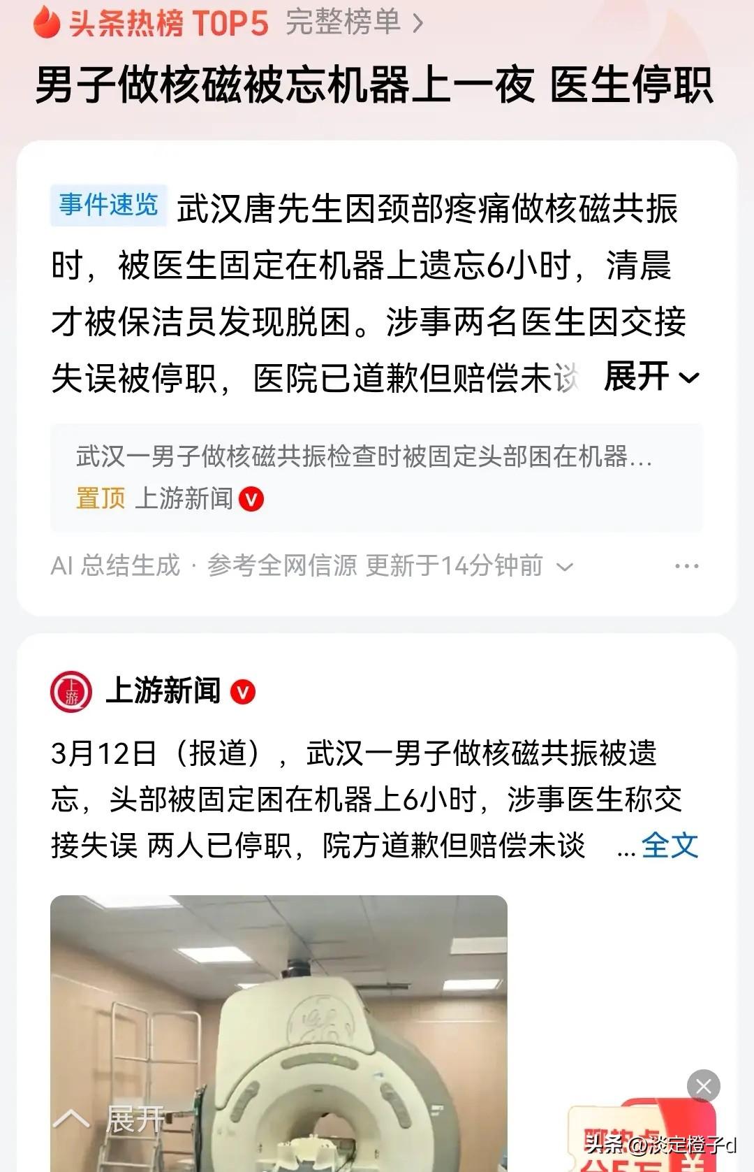 三甲医院核磁惊魂 患者被困6小时遭精神暴击 2月26日凌晨武汉三甲患者被困核磁舱6小时。 新观点清晰,核磁设备无电离辐射,电磁辐射搭配密闭禁锢会造成严重精神创伤,此类事件是管理漏洞引发的责任事故,绝非意外。 小困惑有答案,医院仅对涉事医生停职,放射科岗位吃香、人员紧缺成为轻罚理由,院方建议司法诉讼,精神损伤难以认定,赔偿金额由法院判定。 情绪共鸣戳心,患者头部固定、面罩遮脸,被困如铁笼的狭小舱体,连续呼救无人应答,就医安全感彻底崩塌,普通人遭遇这般糊弄,满心憋屈又无力。 涉事医生擅自离岗,口头交接未核对,接班医生误判无患者自行休息,核磁机长期开启无法快速关停。 清晨保洁员发现险情并上报,院方已致歉并安排全面检查。 核心流程形同虚设,仅停职医生无法弥补伤害,放射科主任与院方管理者应同步担责。 这样的处置方式,大家能接受吗?评论区聊聊。