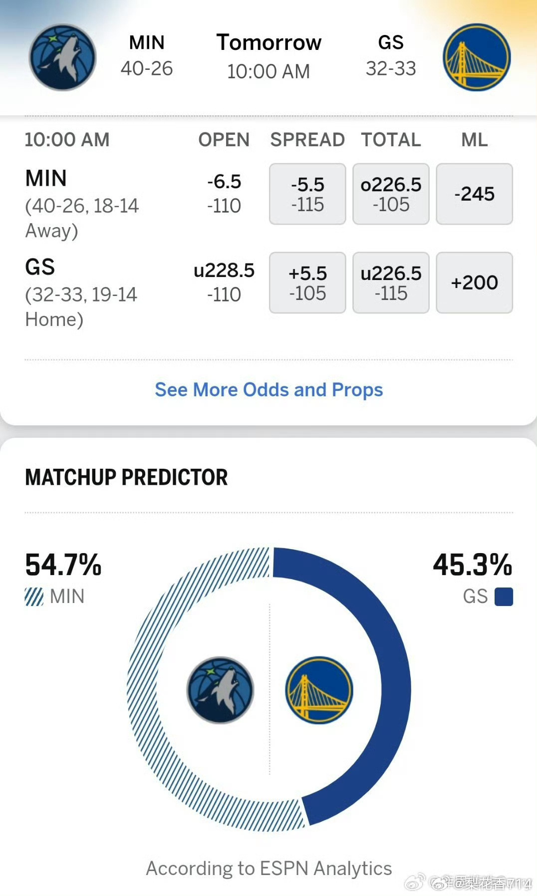ESPN这次给到勇士胜率只有45.3%!而森林狼胜率高达54.7%!两队本赛季前三次交手,勇士只赢了一场!