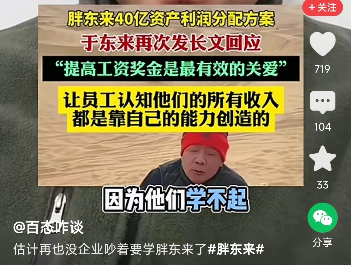 在胖东来面前, 所有的企业都沉默了。 胖东来要把40亿全部分给员工, 那个企业敢这样干, 那个企业愿意这样干, 那个企业有这份魄力。 到目前为止, 那些网红大老板没见一个发声的。 人这一辈子, 如果能碰到于东来这样的老板, 也是这辈子最幸运的事情了。 听说普通员工也能分几十万。 另外这是直接分的, 不是平时的工资和奖金, 和那些跟着老板上市, 靠原始股发家的老员工不是一个性质。