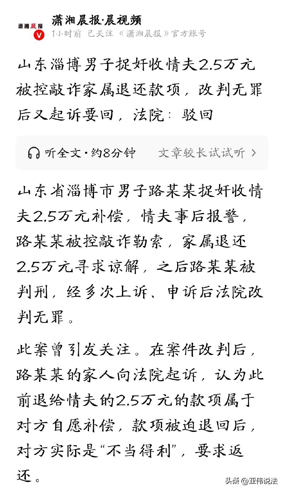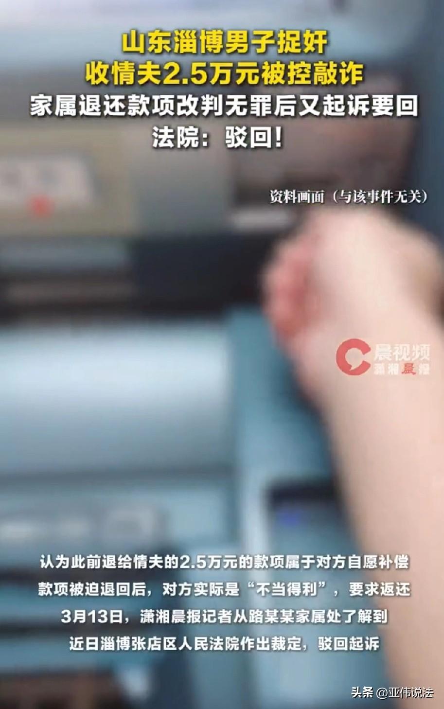 山东淄博,男子怀疑妻子在外面有人,悄悄跟踪她出门,将两人抓了个现行。男子怒了,提起拳头就打,第三者怕事情闹大,主动给了2.5万元私了。谁知,事后第三者觉得自己挨了打还损失了那么多钱,憋屈的很,便报警称男子敲诈勒索。男子父亲急了,赶紧凑了2.5万还给第三者,取得谅解,但男子还是被判有期徒刑6个月。出狱后,男子心有不甘,一直奔走上诉,终于迎来了转机。 2021年3月的一天,路某悄悄跟着妻子出了门。 他其实已经怀疑了好些日子,妻子最近总是心神不宁,手机不离手,接电话躲着人。 那天妻子又打扮得花枝招展,说出去和闺蜜逛街,这借口她早都用烂了,路某根本不相信,妻子前脚出门,他后脚就悄悄跟了上去。 这趟出去果然有收获,路某看到,妻子竟然和一个陌生男子手挽手走一起,举止亲密,就像一对甜蜜的情侣。 路某脑子“嗡”的一声,血直往头上涌,直接冲上去,就提起了拳头。 男子刘某见被撞破,也慌了神,两人发生了争执。刘某自知理亏,怕事情闹大,慌乱中提出愿意给钱私了。 路某正在气头上,想着这些年辛辛苦苦经营的家庭,就这么被人毁了,心里又恨又痛。他没过脑子,直接开了个价,让对方拿6万块钱。 刘某说自己没那么多,他东拼西凑,最后借了2.5万转给了路某某。 钱到手后,路某让刘某离开了。 可这事儿没完,刘某回去后越想越不是滋味,他觉得自己被打了还赔了钱,心里很憋屈。 于是,他报了警,说路某殴打并限制他人身自由,还敲诈了他2.5万元。 警方很快立案,路某被刑事拘留。 路某的父亲一听儿子出了事,简直不敢相信。儿子虽然冲动,但事出有因,绝不是个敲诈勒索的人,可人关在里面,老爷子急得团团转。 为了让儿子能早点出来,他忍着心里的不甘,凑了2.5万,在派出所里亲手还给了刘某。 刘某拿到钱,也写了谅解书。老爷子心想,钱没了可以再挣,人能平安回来就好。 然而,法律程序没有停。2021年11月2日,法院作出一审判决:路某犯敲诈勒索罪,判处有期徒刑6个月,并处罚金5000元。 路某不服,自己老婆被拐跑了,自己才是受害者,凭什么要坐牢?他在狱中煎熬,出来后也一直没有放弃申诉。 终于,事情在2024年有了转机。 淄博中院对该案进行再审,法官明确,路某因配偶被刘某侵害,刘某主动提出补偿,双方多次协商后才收取2.5万,路某无非法占有故意,仅为过错补偿主张。 虽有言语施压,但非为强行索财,不符合本罪构成。 所以,中院最终改判路某无罪。 听到这个判决,路某和父亲抱头痛哭。他们觉得,清白终于回来了。 这时,老爷子又想起那2万5千块钱,当初是为了给儿子办取保候审,被迫退给刘某的,既然儿子无罪,那笔钱凭什么还要给他? 随后,路某父亲向法院又提起诉讼,要求刘某返还那2.5万元和利息。 老爷子那时候身体已经不太好了,查出了淋巴癌,心里更觉得这笔钱该要回来,既是公道,也是急需。 刘某没有出庭,但提交了书面答辩。他说当时是被路某打了、关着,被迫借钱给的,钱本来就是借来的,后来路某父亲退钱,他写了谅解书,事情就了结了。 他认为那笔钱是路某的非法所得,还回来是天经地义。 《民法典》第8条规定∶民事主体从事民事活动,不得违反法律,不得违背公序良俗 。 路某向刘某索偿,源于婚外情过错补偿,我国无“第三者侵害配偶权”的明确侵权规定,该给付属不法原因给付,违背公序良俗。 路父退钱是刑事谅解行为,主体不适格且该给付不受法律保护。 但我国法律对第三者侵害配偶权没有明确规定,司法实践中一般不认为这构成侵权。 刘某给钱,属于一种“不法原因的给付”,法律不保护这种行为。 综上,法院最终驳回了陆某父亲的上诉。 路某父亲没有放弃,表示要继续上诉。 同时,路某还一直没放弃追究刘某诬告陷害的责任。 刘某之前在报案时说,路某捉奸时威胁他说要6万,不给就把他拖山上埋了,路某的父亲认为,这完全是瞎编,是在诬陷儿子。 可派出所调查后认为,刘某是认知错误,属于错告,不构成诬告陷害罪,不予立案。 路某和父亲都觉得,这事不能就这么算了,不但要要回那2.5万元,还要为“诬告”讨个说法。