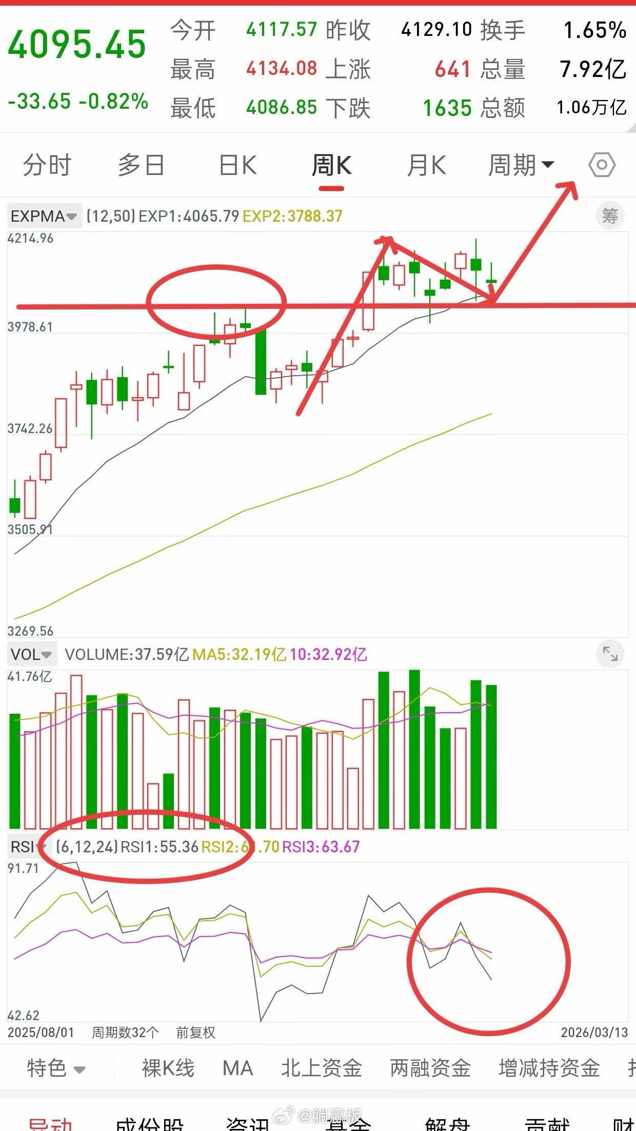 阶段低点4002,4050左右,可以说基本就在4000-4200这个大区间震荡。