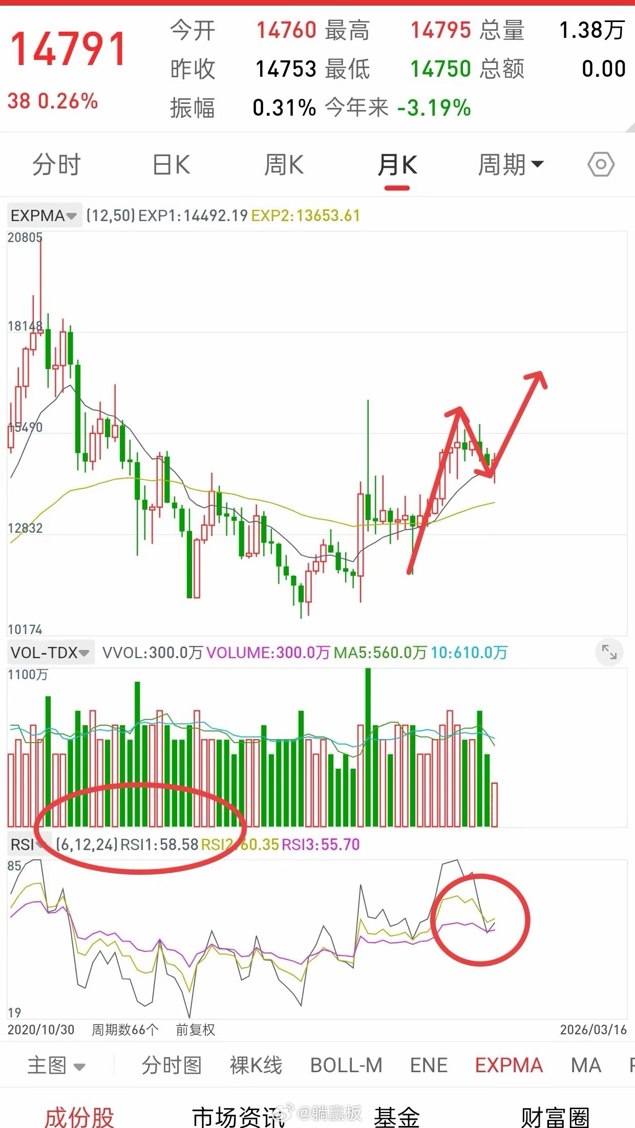 富时A50股指月线级别已经打到EXPMA白线支撑,Rsi指标也是从前期的超买,修复到目前58,标准的正常多头趋势。