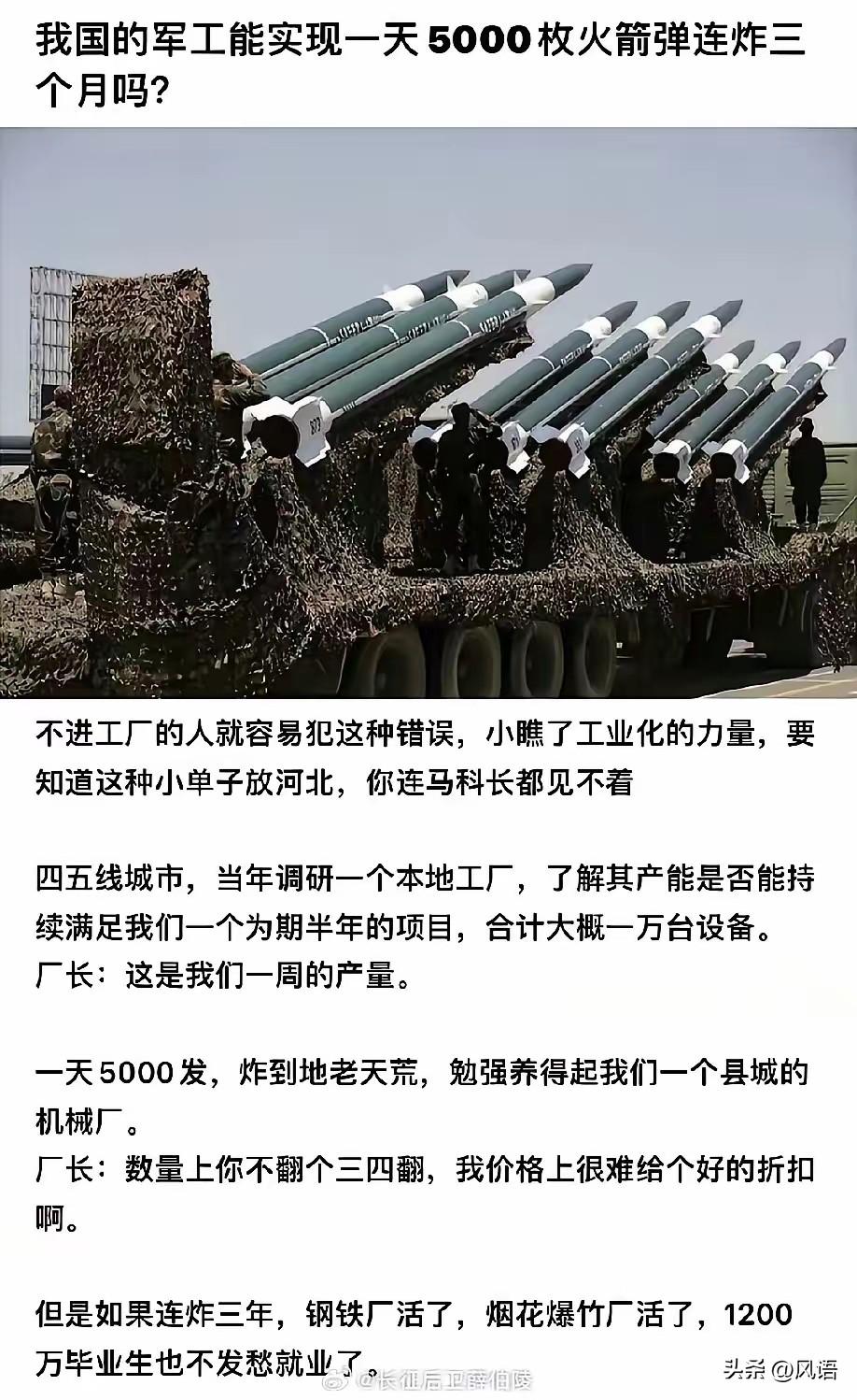 一天5000枚火箭弹够吗? 如果真落入攻坚战,这是不够的,俄罗斯打利西昌斯克,一天的榴弹是8万发,火箭弹与榴弹,尽管在当量上有所区别,但是它打的只是一个城市。 真到了这么一天,一天的火箭弹数量要上10万级,而且要连续三天,千万不能算经济帐,更不能打成添油仗,要狠,要准,才能快。 像一天10万,三天只是一个基数,要至少准备的三个基数,也就是100万发左右,因为战事一开,很可能有三场,而且“存亡危急”的这一场更为重要。