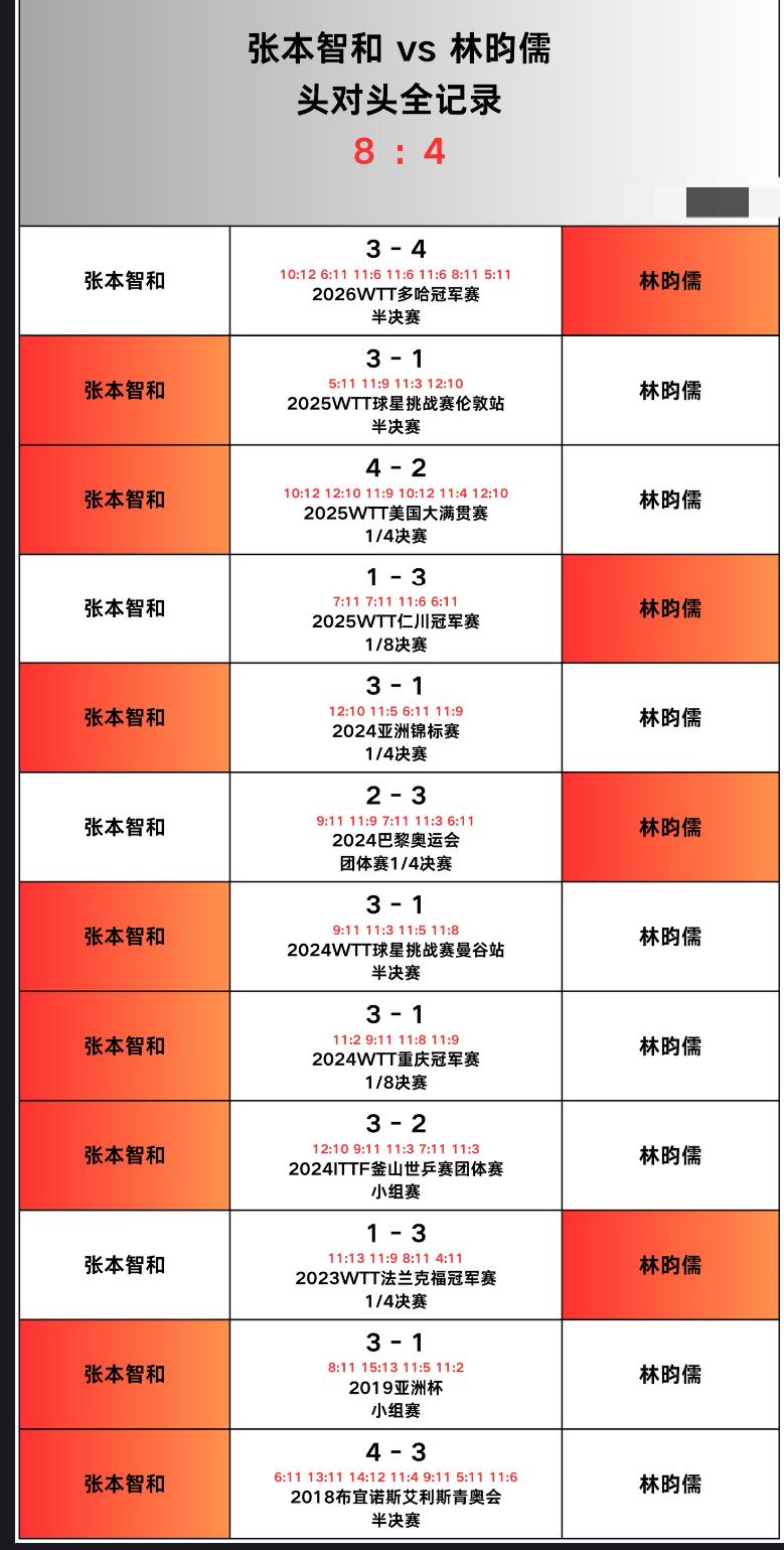 张本智和与林昀儒的头对头全记录——重庆冠军赛男单1/4对阵 林昀儒VS张本智和, 重庆冠军赛张本智和3:0宇田 , 晋级8强! 林昀儒3:1周启豪,晋级8强! 1/4决赛中, 林昀儒VS张本智和, 林昀儒对张本保持4胜8负的 劣势战绩! 最后一次比赛是在今年的 多哈冠军赛中, 当时林昀儒4:3张本智和, 林昀儒在换球拍后涨球很多, 目前的实力, 林昀儒与张本不分上下, 就看明天的临场发挥和应变能力!