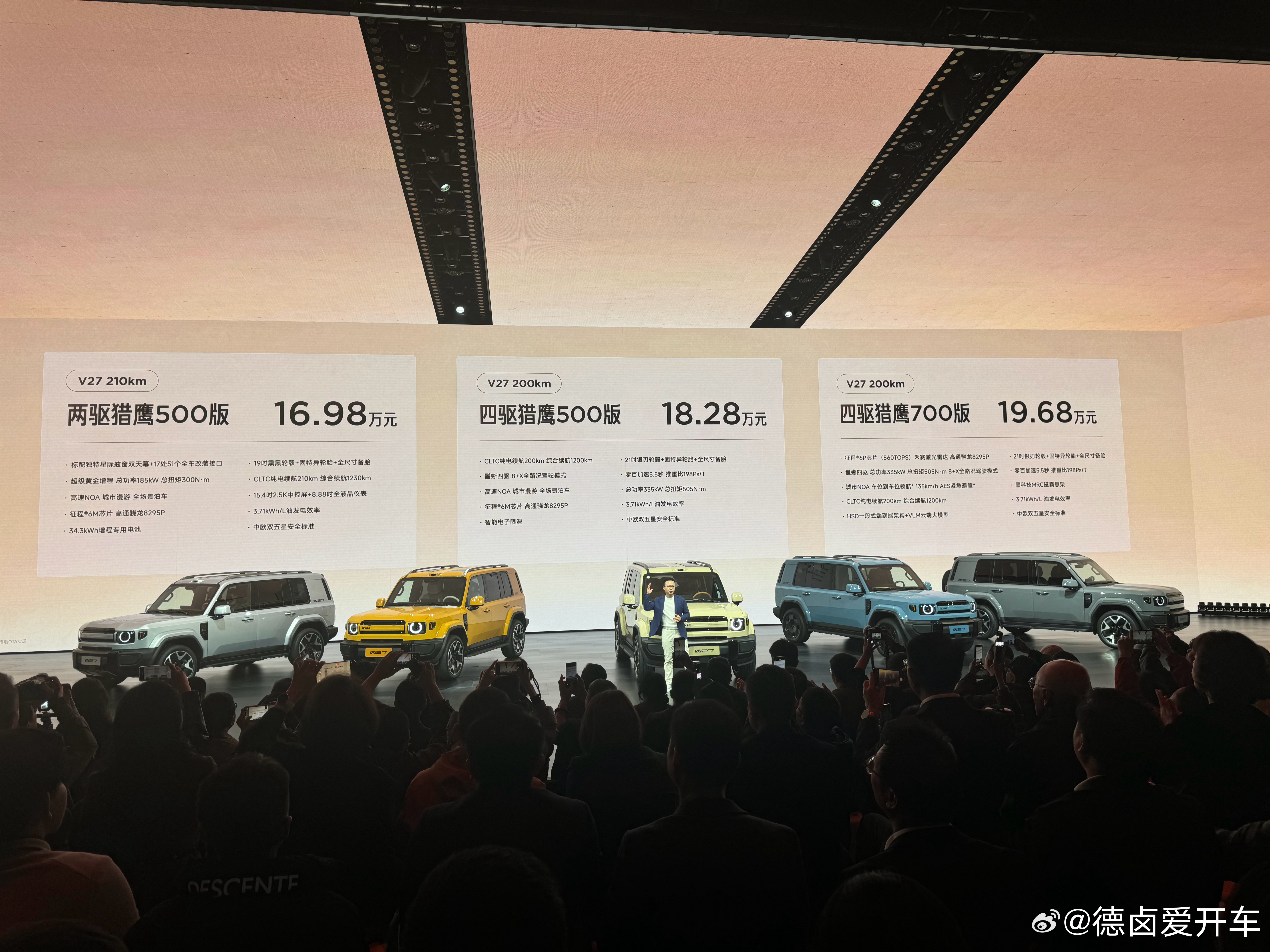 现场直接放出三款配置:两驱猎鹰500版16.98万,四驱猎鹰500版18.28万,四驱猎鹰700版19.68万;