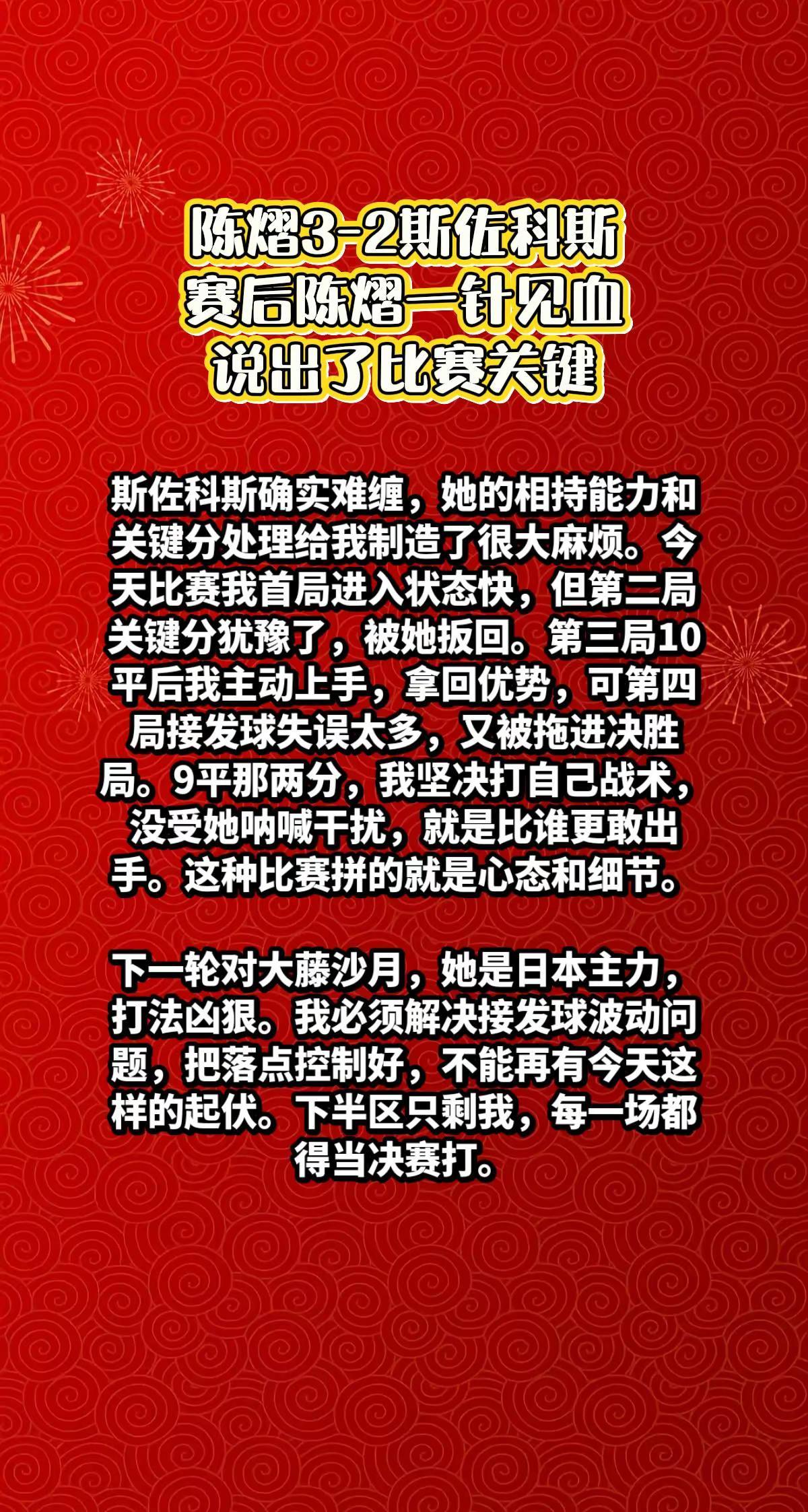 陈熠3-2斯佐科斯,赛后陈熠说出关键。