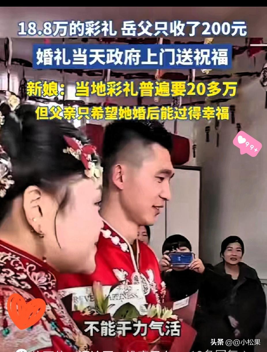 看哭了!山东梁山这场婚礼,狠狠打脸天价彩礼!18.8万彩礼摆上桌,新娘父亲只抽走200元,其余全额退回,当地更是上门送祝福,为这股婚俗新风点赞。 当地普遍彩礼20万起,新娘心疼婆家不易,本就和家人商量只收一两万意思一下,可父亲比她更通透,一句“只要你幸福就行”,这200元不是寒酸,是父亲给女儿最足的底气,是不把婚姻当交易、不把女儿当商品。 真正的爱从来不是明码标价,而是互相体谅、彼此成全。天价彩礼撑不起幸福,真心实意才能守住日子。这位父亲用最朴素的举动告诉所有人:嫁女儿,嫁的是安稳幸福,不是攀比与负担。这样的家风,比多少财富都珍贵,值得所有人学习!