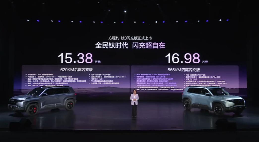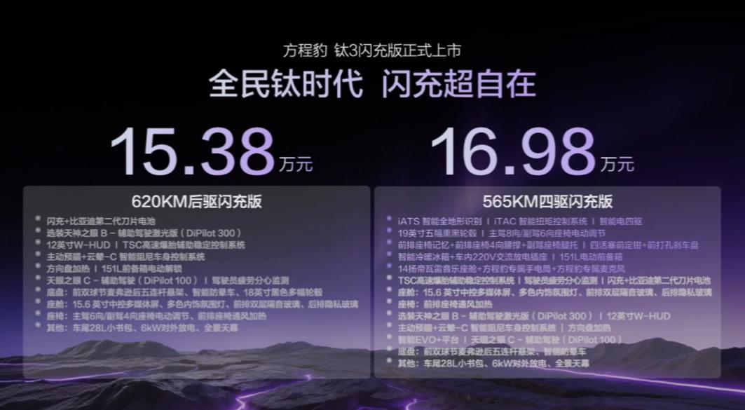 15.38-16.98万的闪充版钛3可以持币待购了? 基础参数:4605*1900*1720mm,轴距2745mm(紧凑型SUV) 驱动形式:纯电 纯电续航:四驱565/后驱620km 电机功率:后240kW 零百加速:7.3-4.7s 充电平台:800V+支持闪充 电池容量:75.6kWh 电池类型:磷酸铁锂/二代刀片电池 悬挂:前麦弗逊后五连杆 智驾辅助:天神之眼B/天神之眼C 轮毂尺寸:18寸轮毂 屏幕:8.8液晶仪表+15.6中控屏+12寸HUD 外观:紫/银 内饰:灰+蓝/拼色/渐变色 座椅:皮座椅 15.38万 620km后驱闪充版 12寸HUD/云辇C+预瞄/18寸轮毂/8扬声器 主副驾电调/TBC防爆胎/车顶行李架/方向盘加热/前排50w无线充 16.98万 565km四驱闪充版 天神之眼C/零百4.7s/四驱 19寸轮毂/14扬/前排双侧隔音玻璃+后排私隐玻璃/打孔刹车盘9前后红色卡钳 前排座椅加热通风+主驾腰托/车内220v/ 专属手电筒+麦克风/冷暖冰箱/电前备箱/前排升降杯托 选装: 天神之眼B+激光雷达 9900元 只有2个配置,一个后驱,一个四驱,HUD已经给到了,教授觉得虽然续航有所增加,但旧款依然值得期待(在优惠1万+的情况下),如果不是太急的话,钛3这价格还是值得等等的,+了一些续航,升级了电池,但是价格也上来了,年底可能价格会更香呢。【来自懂车帝车友圈】