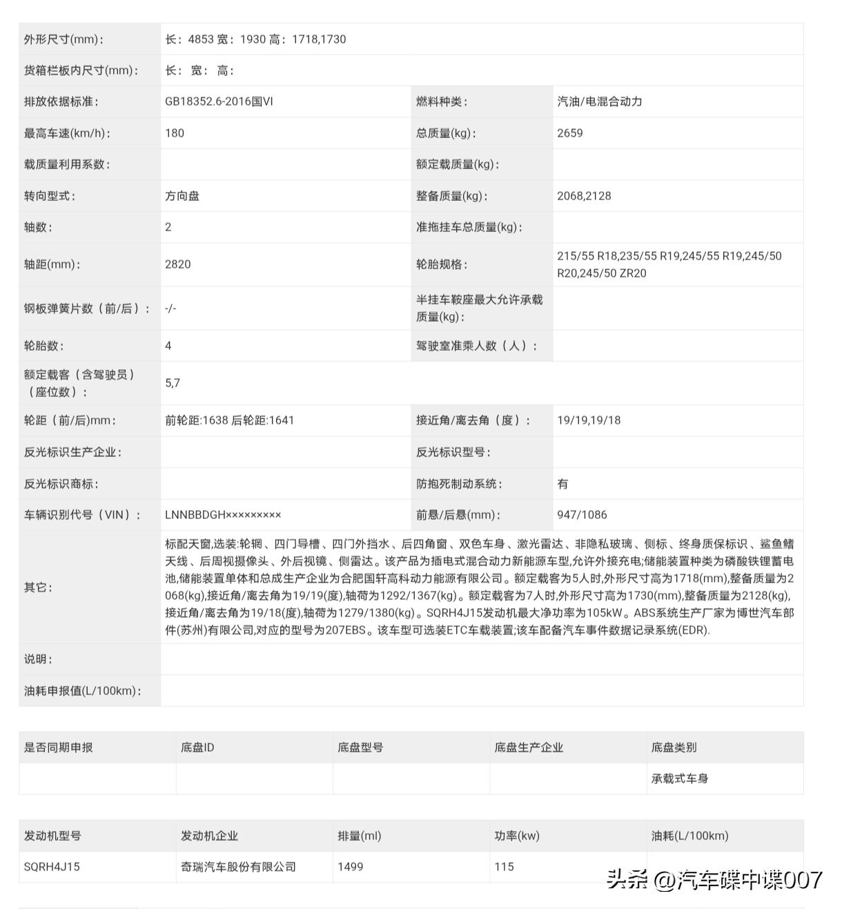 瑞虎9 C - DM的申报信息一经披露,着实令人满心期待!它是奇瑞在燃油版瑞虎9基础上升级打造的插混车型,于2024年上海车展首次亮相,2025年上市后持续迭代。 这款中型SUV聚焦家庭出行场景,注重高速行驶稳定性。它搭载1.5T混动发动机与3DHT三档电混变速箱,WLTC纯电续航达165km,综合续航超1400km。其外观运用“自然力量美学”设计理念,辨识度极高。车身尺寸为4853×1930×1718(7座版为1730)mm,轴距2820mm,内部空间十分宽敞。值得一提的是,申报图中出现了激光雷达,这意味着它将配备猎鹰700高阶辅助驾驶系统。真让人迫不及待盼着它正式上市!