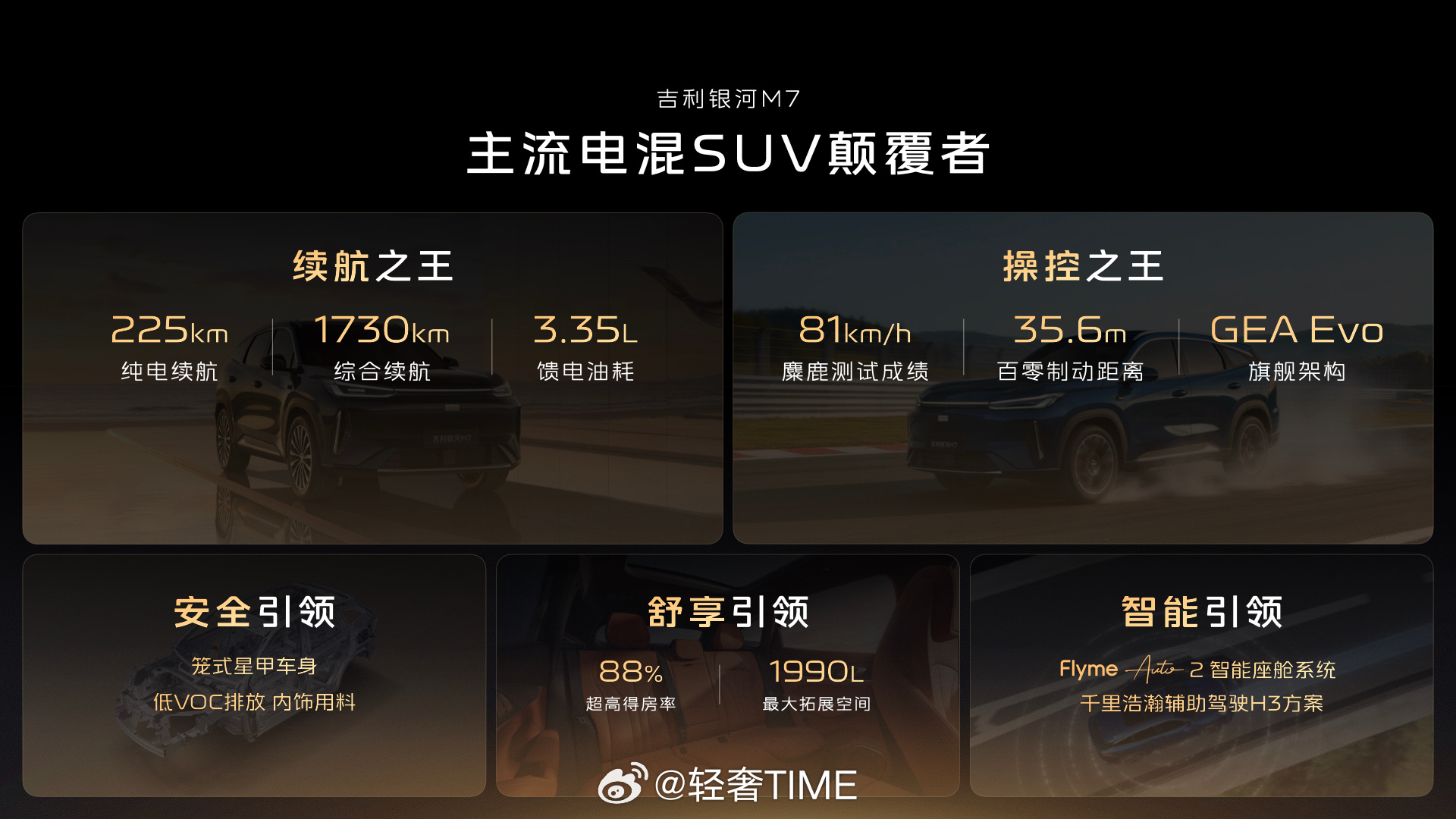 从前合资车引以为傲的50:50现在吉利银河M7一台电混SUV也做到了,麋鹿测试达到了81km/h!搭配了23个扬声器,核心部位100%高强度钢,想要购买这个价位SUV的车友可以看看它!吉利银河M7首搭神盾金砖电池