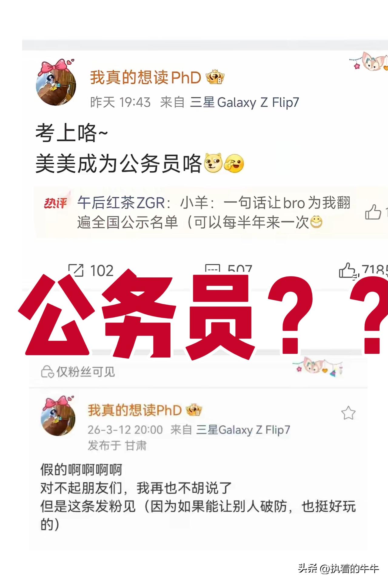 杨某媛在社媒上发布了两个消息, 一个是说考上公务员, 另一个辩解说是考公假的,这事我分析了一下…. 很多人说考公应该是真的。虽然有人质疑政审会有点问题,但是换位思考,也许人家有自己的一套办法,所以政审应该对她影响不大。 至于她又出来辩解,她或许忘了还有公示期,害怕公示期被举报,所以改口了。 不管这事是真是假,她的所作所为都让人心寒,要是品行低劣的人真能踏入公职队伍,那才是对公平正义最大的亵渎。 大家纷纷留言要发动大家盯紧此人,还说绝不能让她到国家单位诬陷别人,此人要是成为公务人员,肯定会危害一方。 也难怪网友们愤愤不平,公道自在人心,底线绝不能被践踏!前面的事还没处理干净,这又出来作妖了。你说是不?
