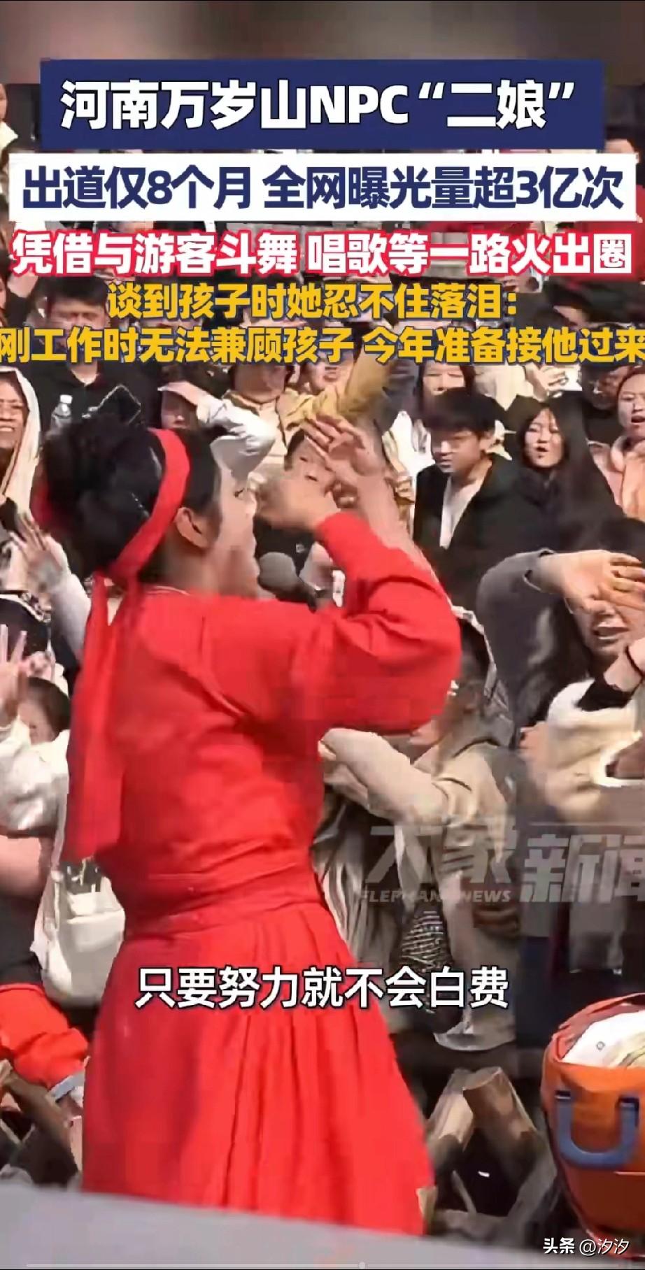 河南万岁山N PC2娘火了, 出道仅仅8个月, 直接在网上被曝光三亿次, 刚出道时也是在角落里, 但是凭借接地气, 集合游客互动唱歌出名, 现在也算是个大网红了, 钱是挣到了很多, 但是感觉对不起儿子, 刚工作的时候照顾不了儿子, 每当看到儿子的视频都落泪, 如今打算把儿子接到开封上学, 回忆起自己的来时路, 她也是感慨万千, 刚进入工作岗位的她, 每天都非常的努力, 相信自己,一定会成功, 没想到真的成功了, 人有的时候就是这样, 殊不知哪一次机会就让你爆火了, 现在的网络力量真的强大, 给了普通人一些翻身的机会, 只要能抓住机会, 还真的可以实现逆袭, 大家觉得呢? 河南 万岁山